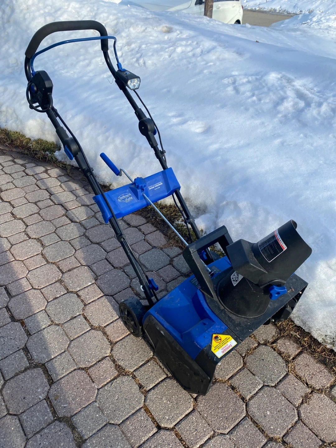 This Greenworks electric snow thrower is blue and black. It features an LED headlight for visibility and has wheels for easy maneuvering. It's powered by electricity and can be used for clearing driveways and walkways after a snowfall. This takes up too much space in my garage, so it’s priced to sell fast.