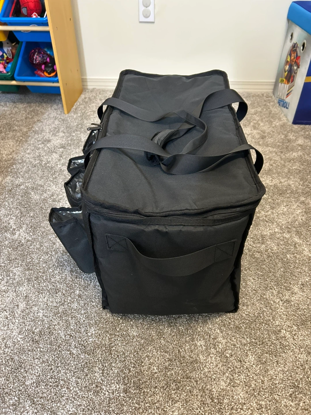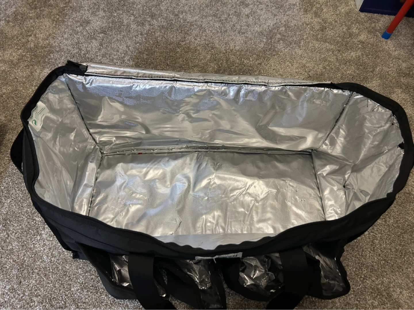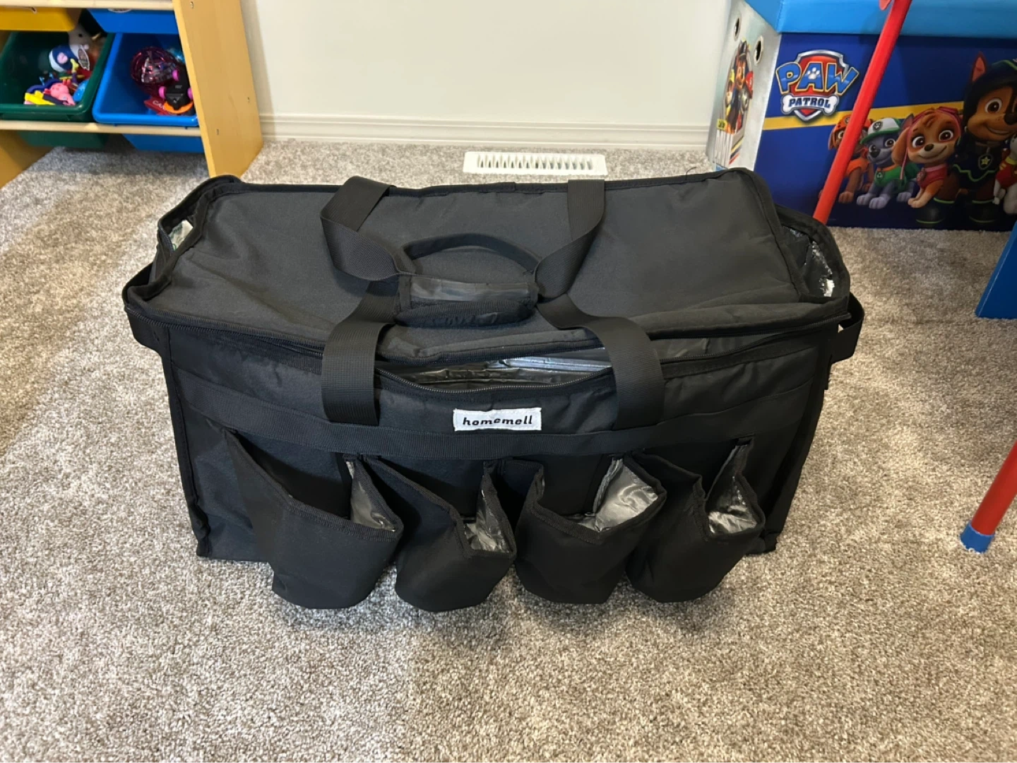 This black Homemell insulated bag is designed for food delivery. It features multiple exterior pockets and a spacious interior with a silver lining. Made from durable nylon material.