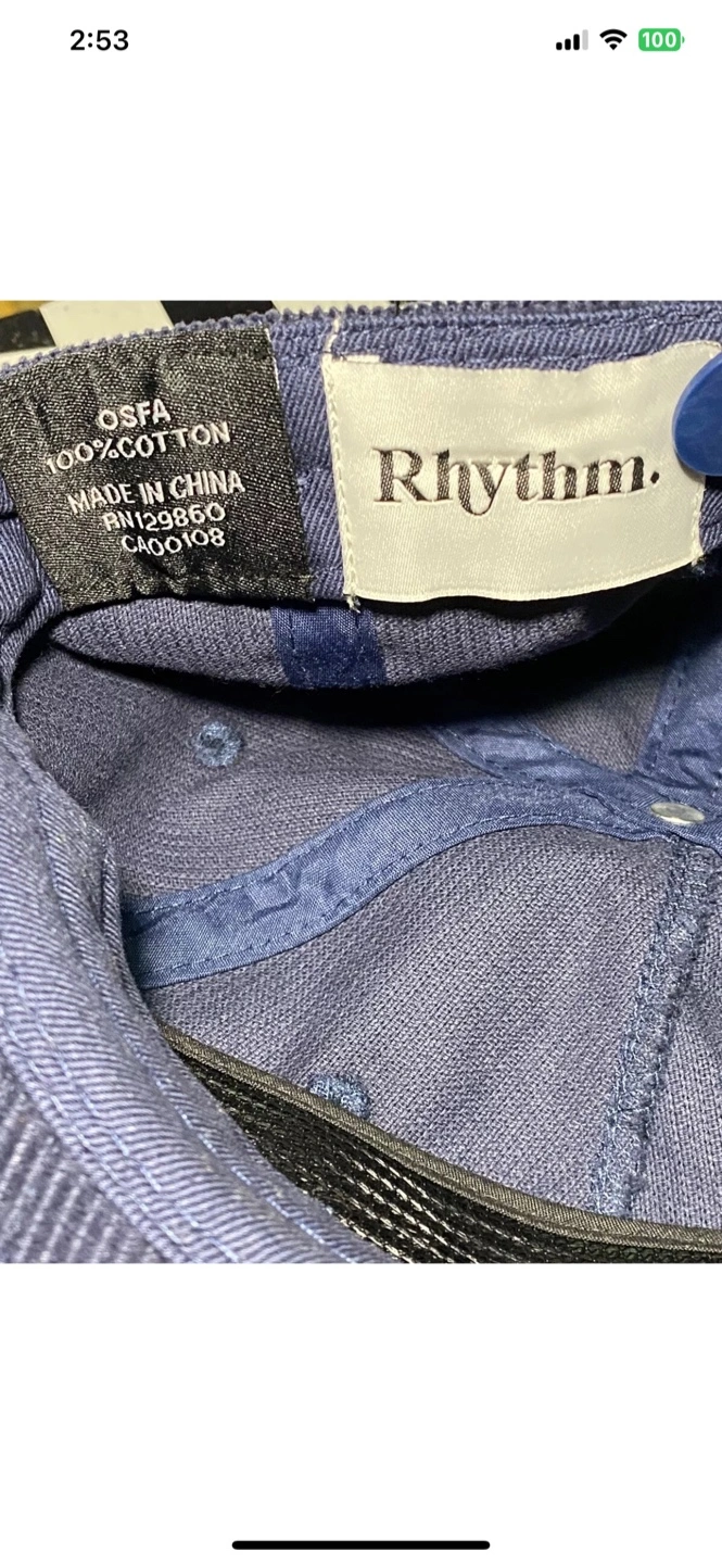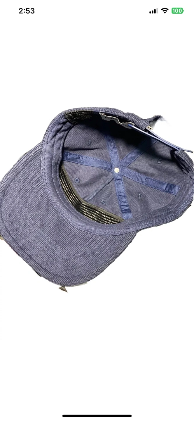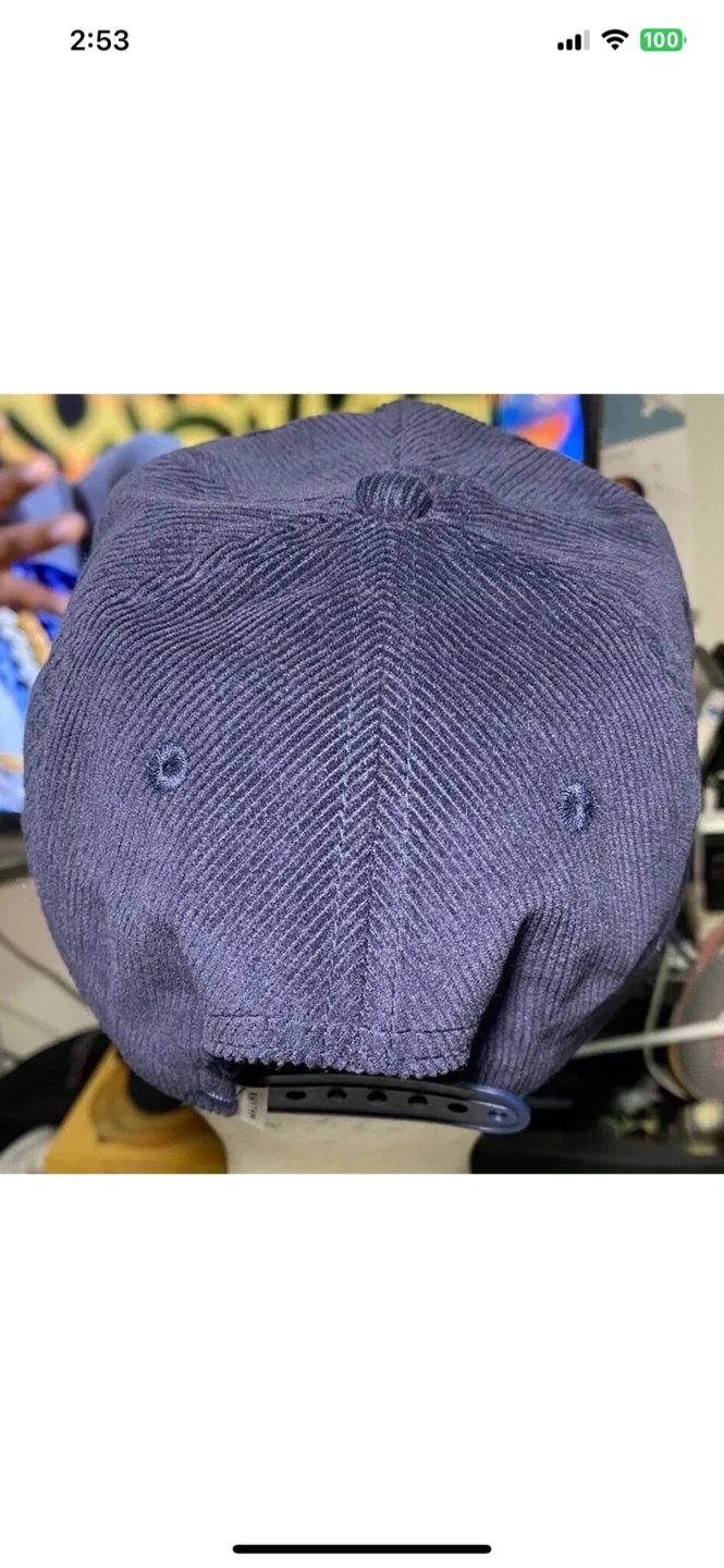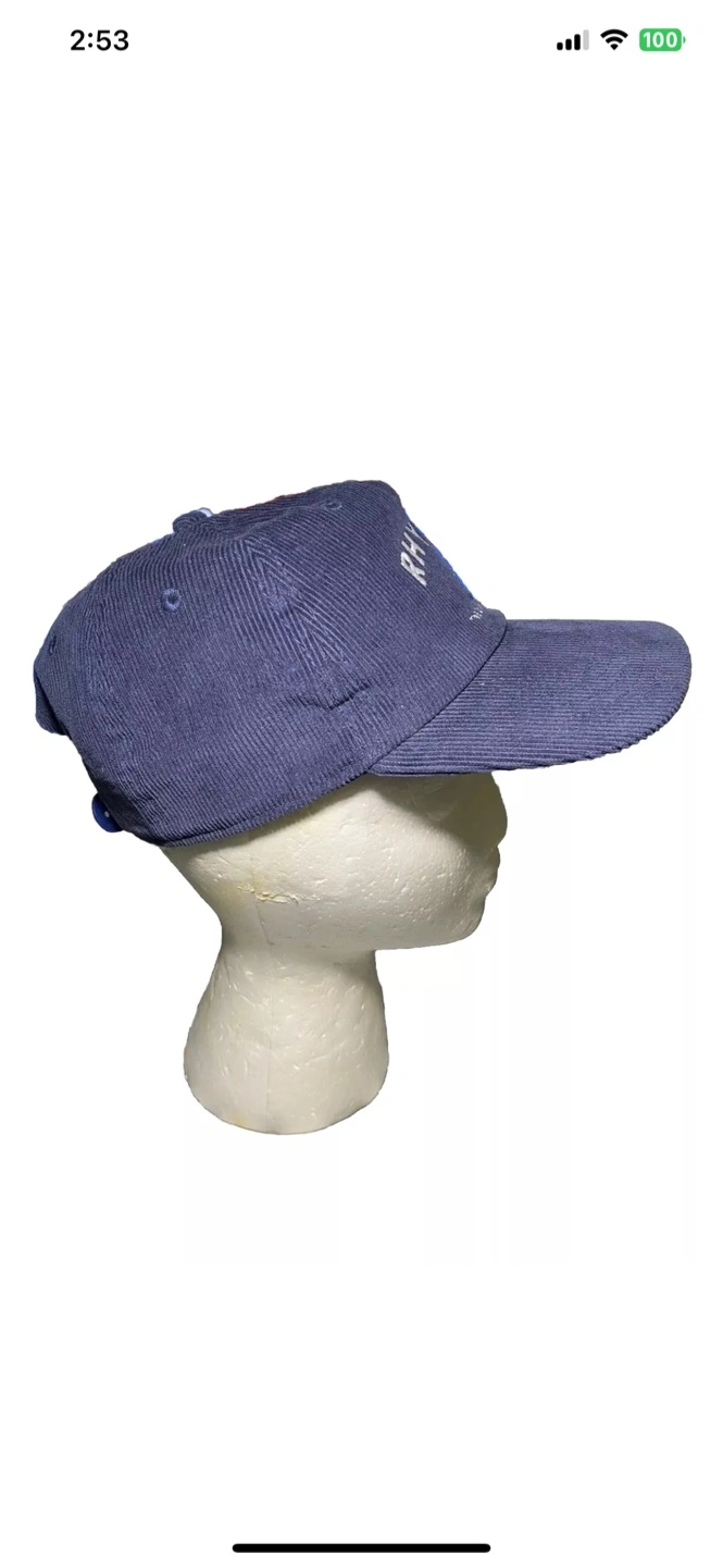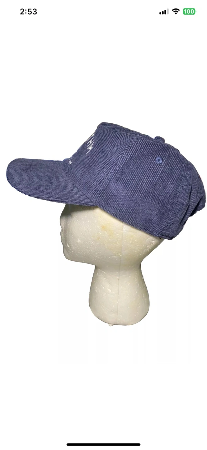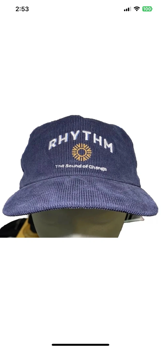 Blue corduroy baseball cap. Features embroidered logo. One size fits all. Made in China. Rhythm The Sound Of Change Central Cord Adjustable Corduroy Vintage Style Hat