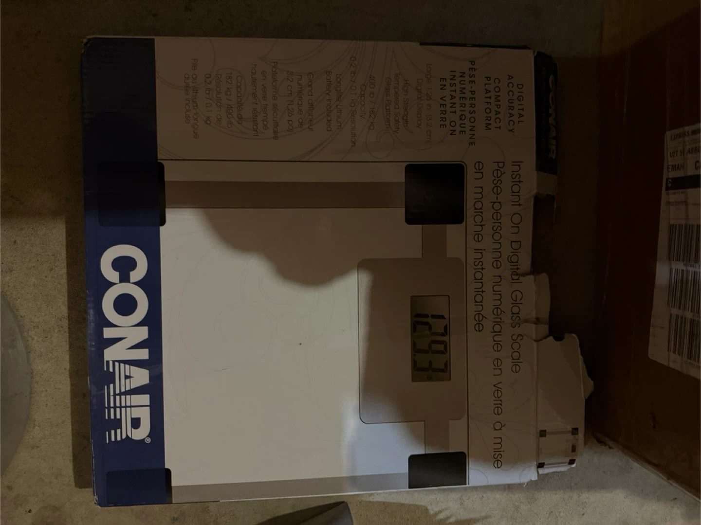 This is a Conair digital glass scale. It has a large LCD display and a compact design. The scale measures in pounds, kilograms, and stones.