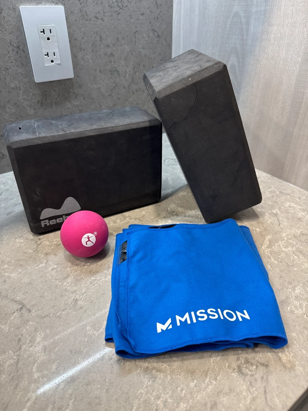 This set includes two black Reehut yoga blocks and two blue Mission cooling towel. The blocks are made of dense foam for support. The towel is designed for athletic use.