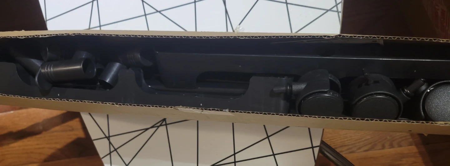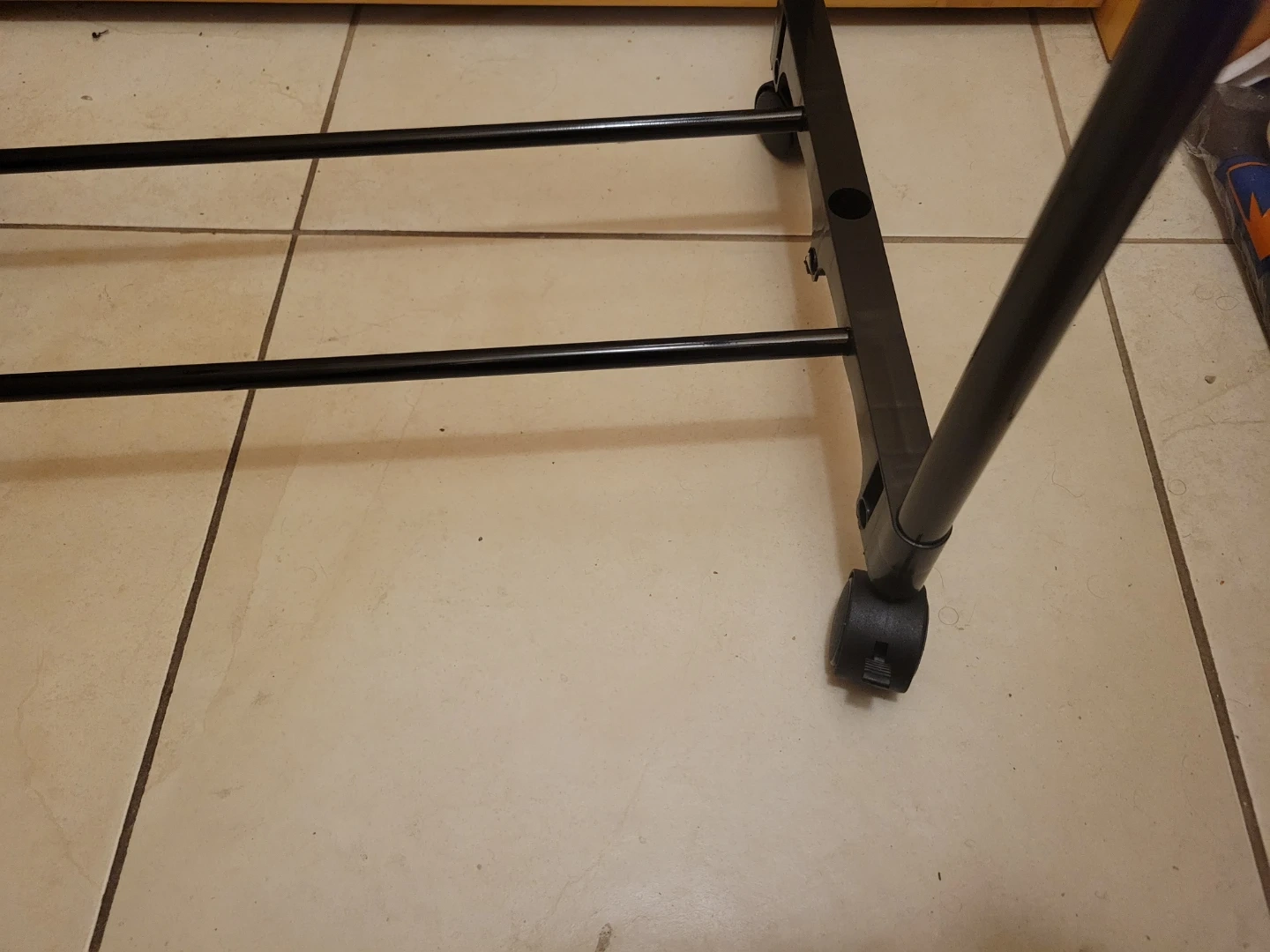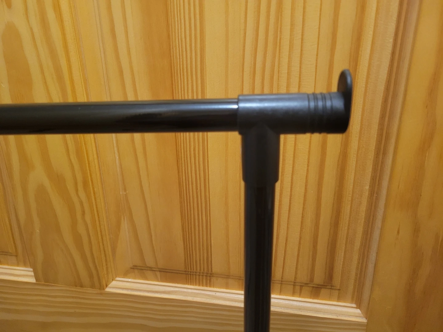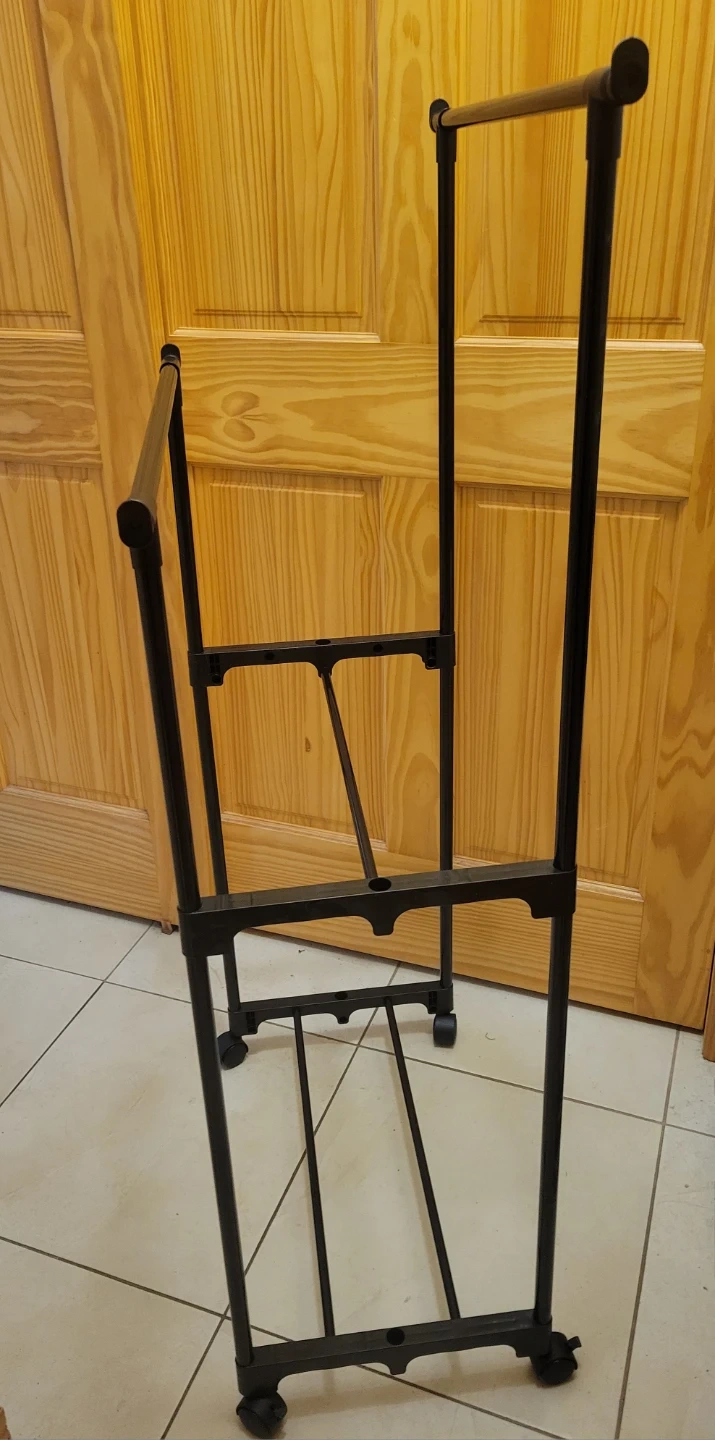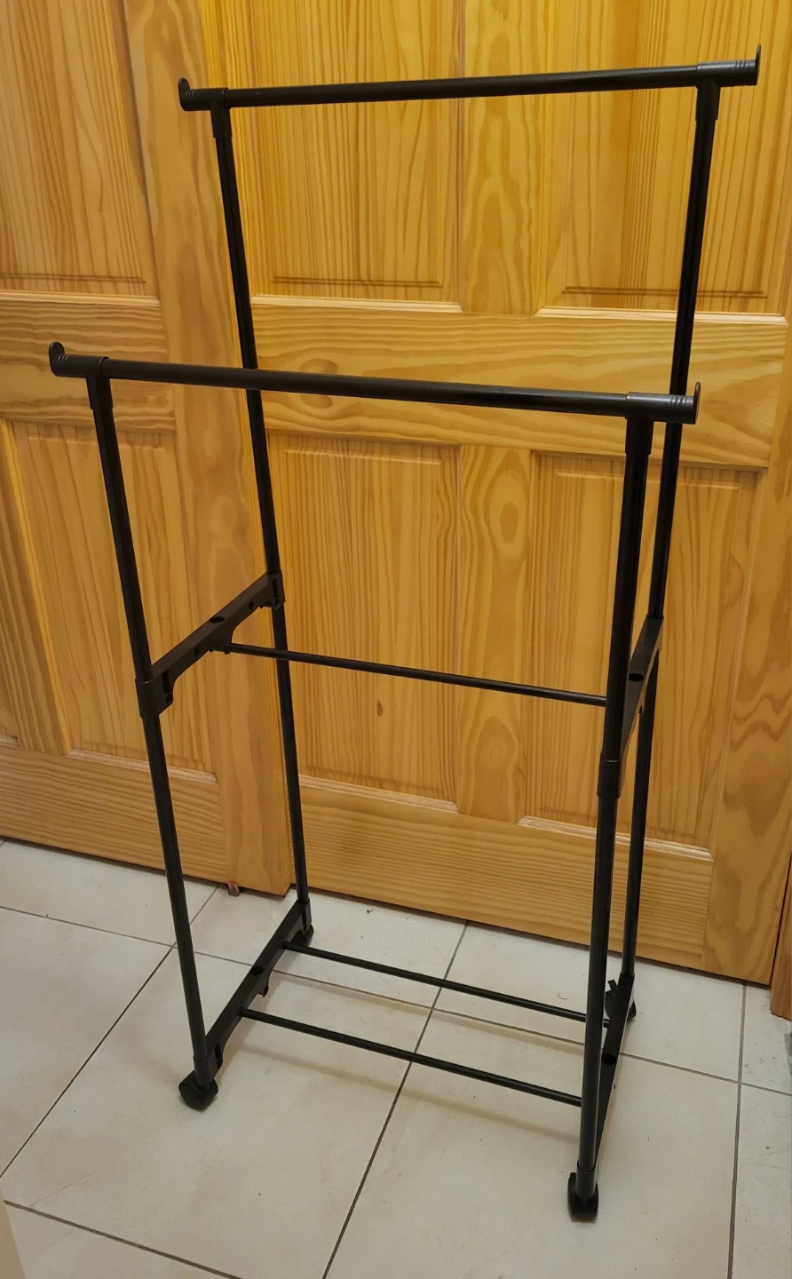 This black metal clothes rack features two tiers for hanging garments. It's equipped with wheels for easy mobility. Includes original packaging and all components. Was assembled only for making photos, never used.