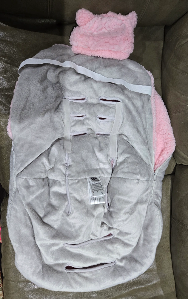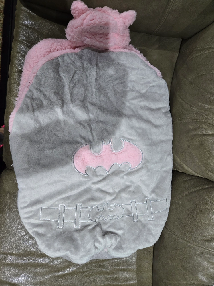 Grey and pink car seat cozy. Features a Batman logo and a matching hat. Has straps to fit in car seat.