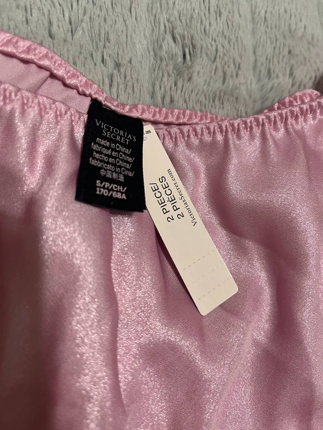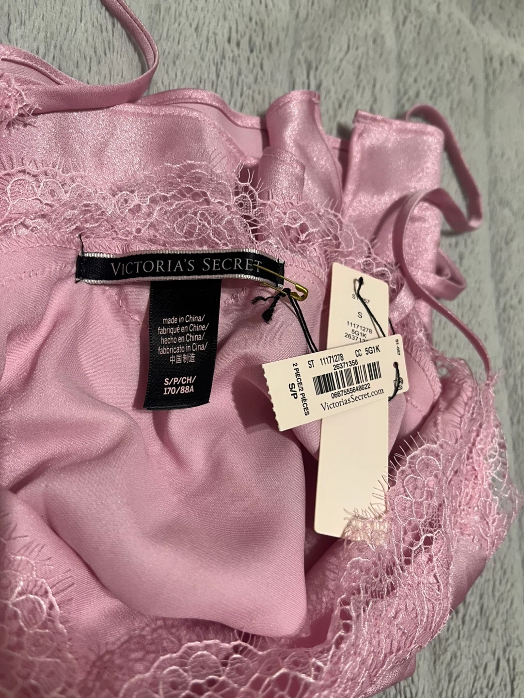 Victoria's Secret two-piece pajama set. Includes a cami top and shorts. Features lace trim detailing. Size Small. Never worn.
