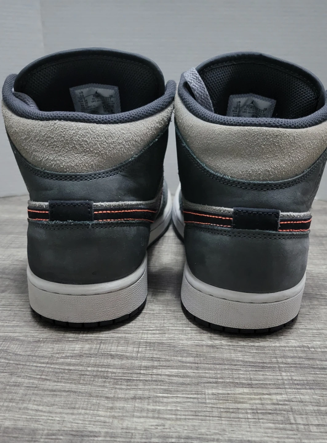 Men's Air Jordan 1 Mid SE sneakers in a grey and black colorway. Features orange accents and the iconic Air Jordan wings logo. Size US 10.