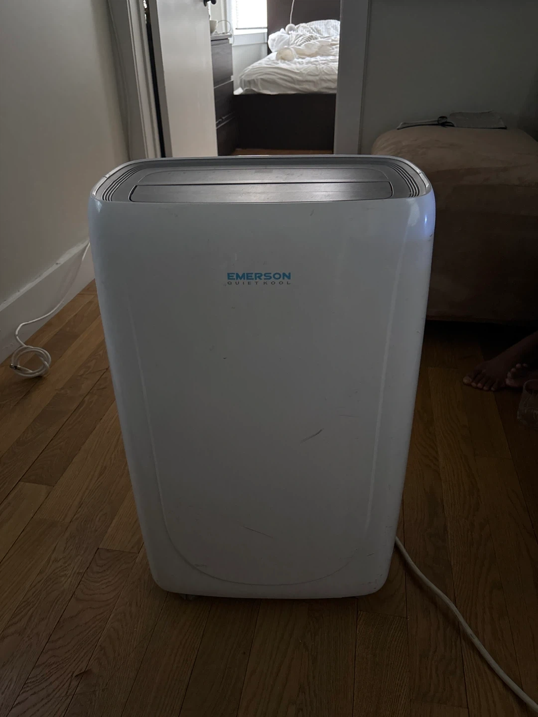 This Emerson Quiet Kool portable air conditioner is white and includes an exhaust hose. It's a great way to cool down a room! The unit measures approximately 30 inches tall. Open to negotiate