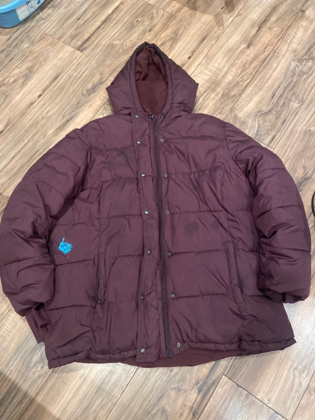 Selling a burgundy puffer jacket. It has a hood and snap buttons. There are some signs of wear on the jacket such as stains on front.