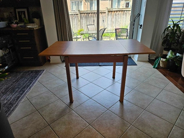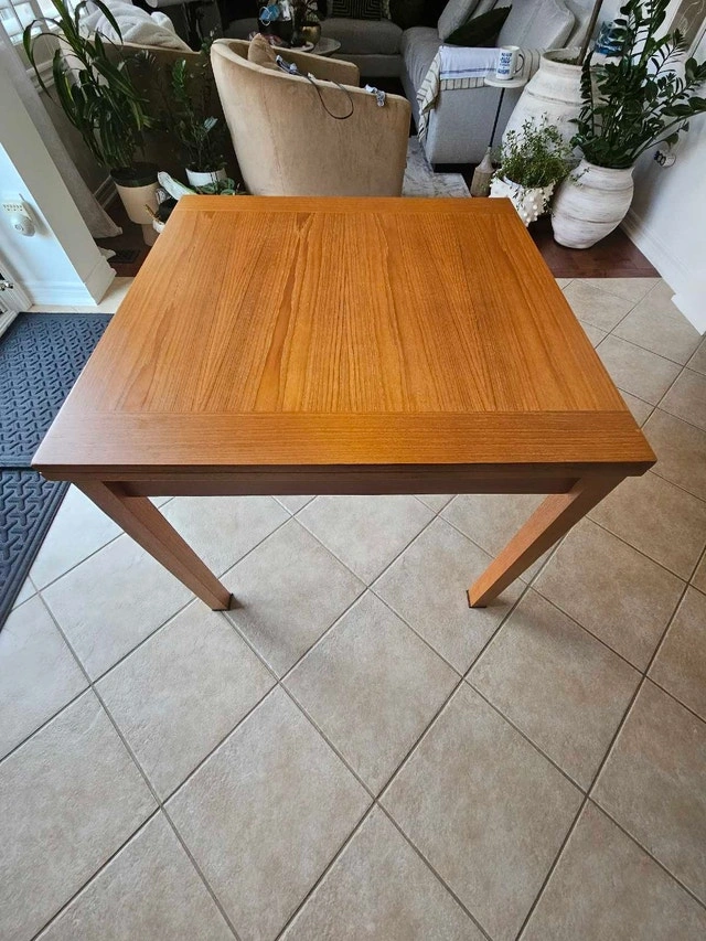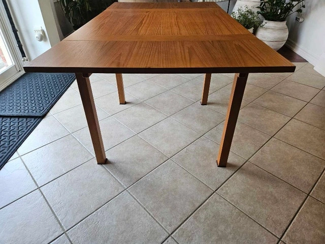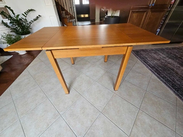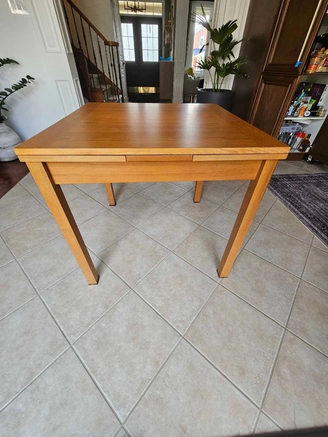 Solid refinished kitchen or dining room table. Extended: 55 inches (140 cm) wide, 31.5 inches (80 cm) wide, 29 inches (74 cm) high.