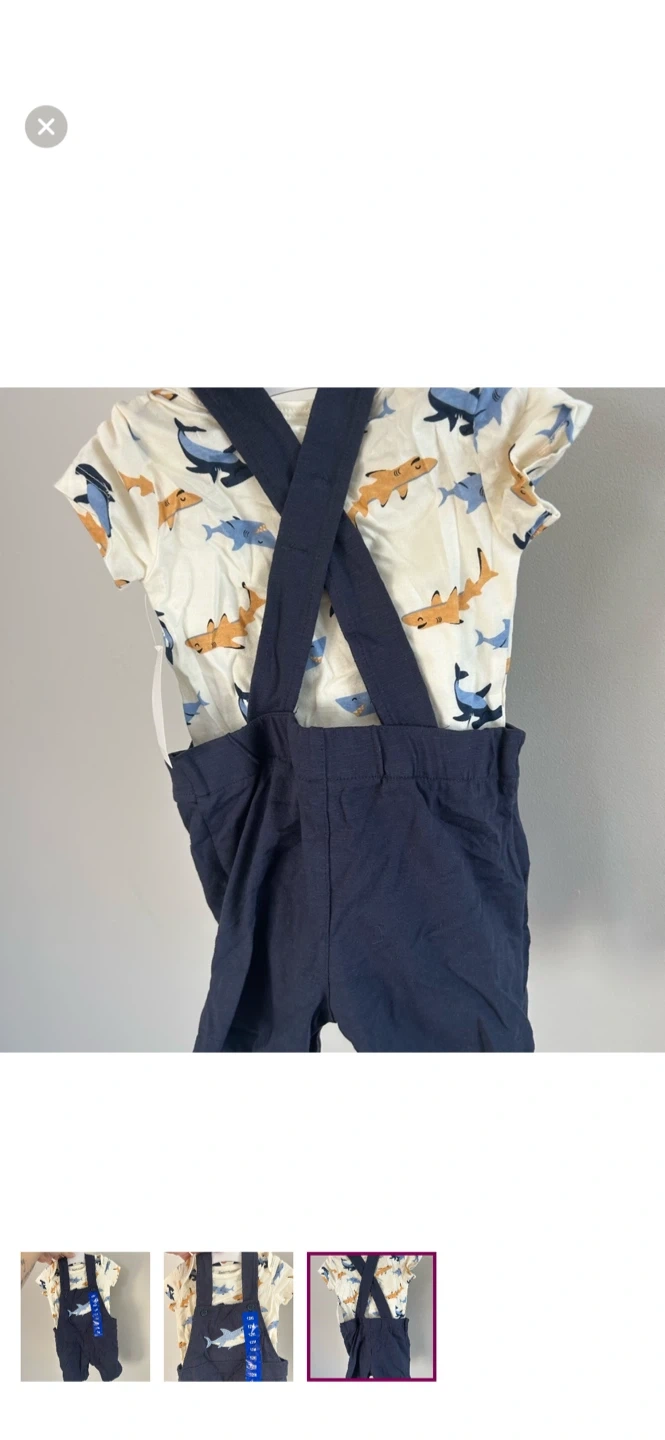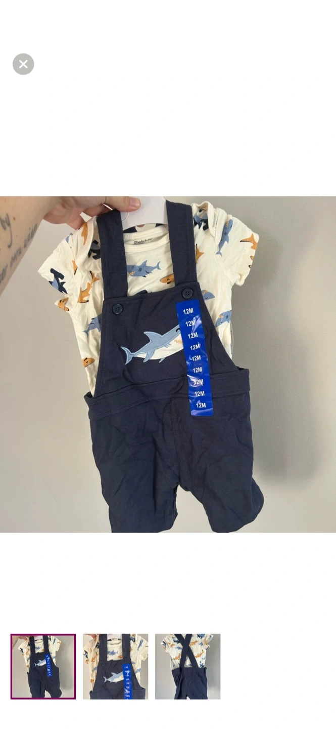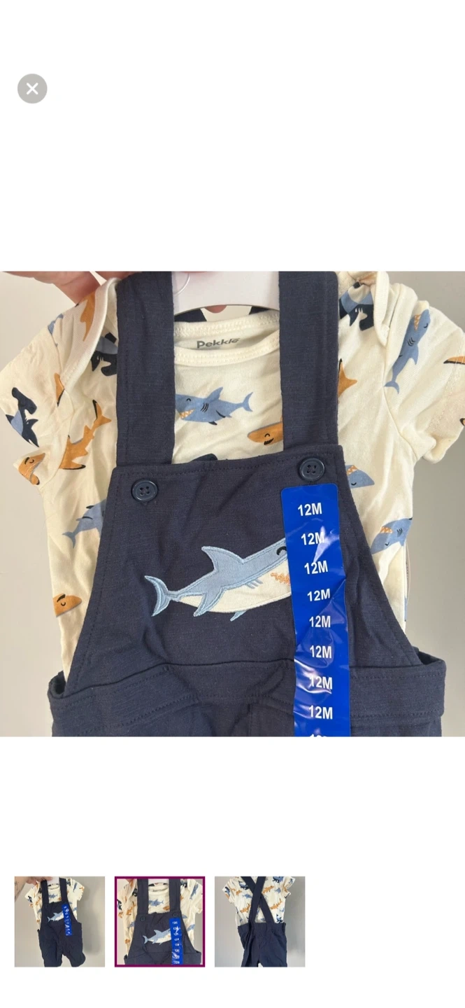 Pekkle brand. Short sleeve onesie and overalls matching set. Blue shark design. Size 12m. Brand new condition