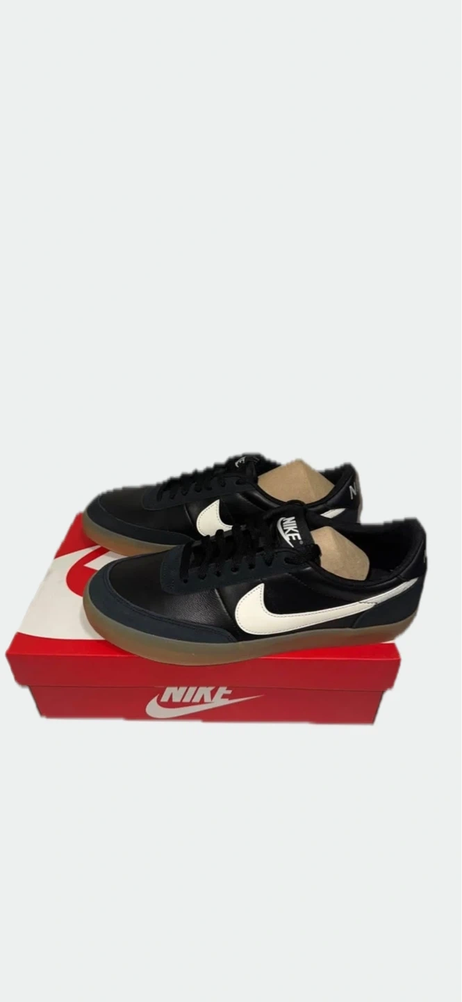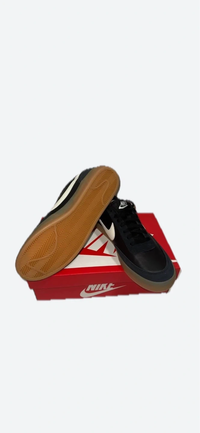A pair of black Nike sneakers with white swoosh and gum sole. These shoes are in excellent condition. The original box is included.