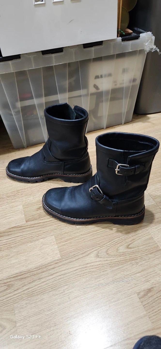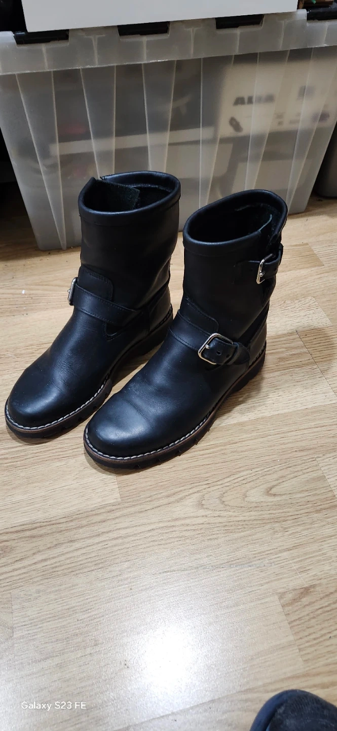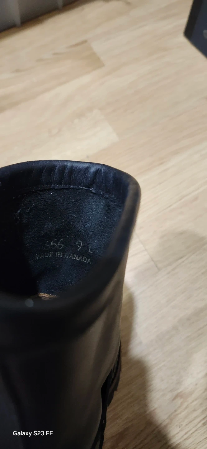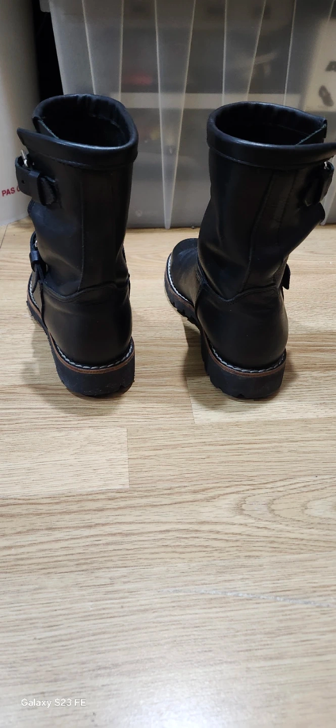 These are black leather boots with buckle accents. They have a sturdy sole and a comfortable interior. Great for everyday wear! Price firm only cash only pickup no delivery 801 O'Connor drive outside TD Canada Trust bank door East York.