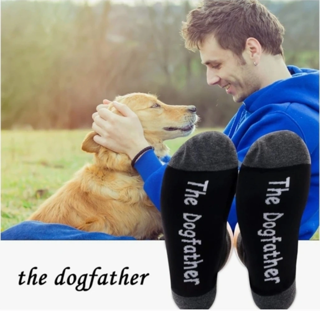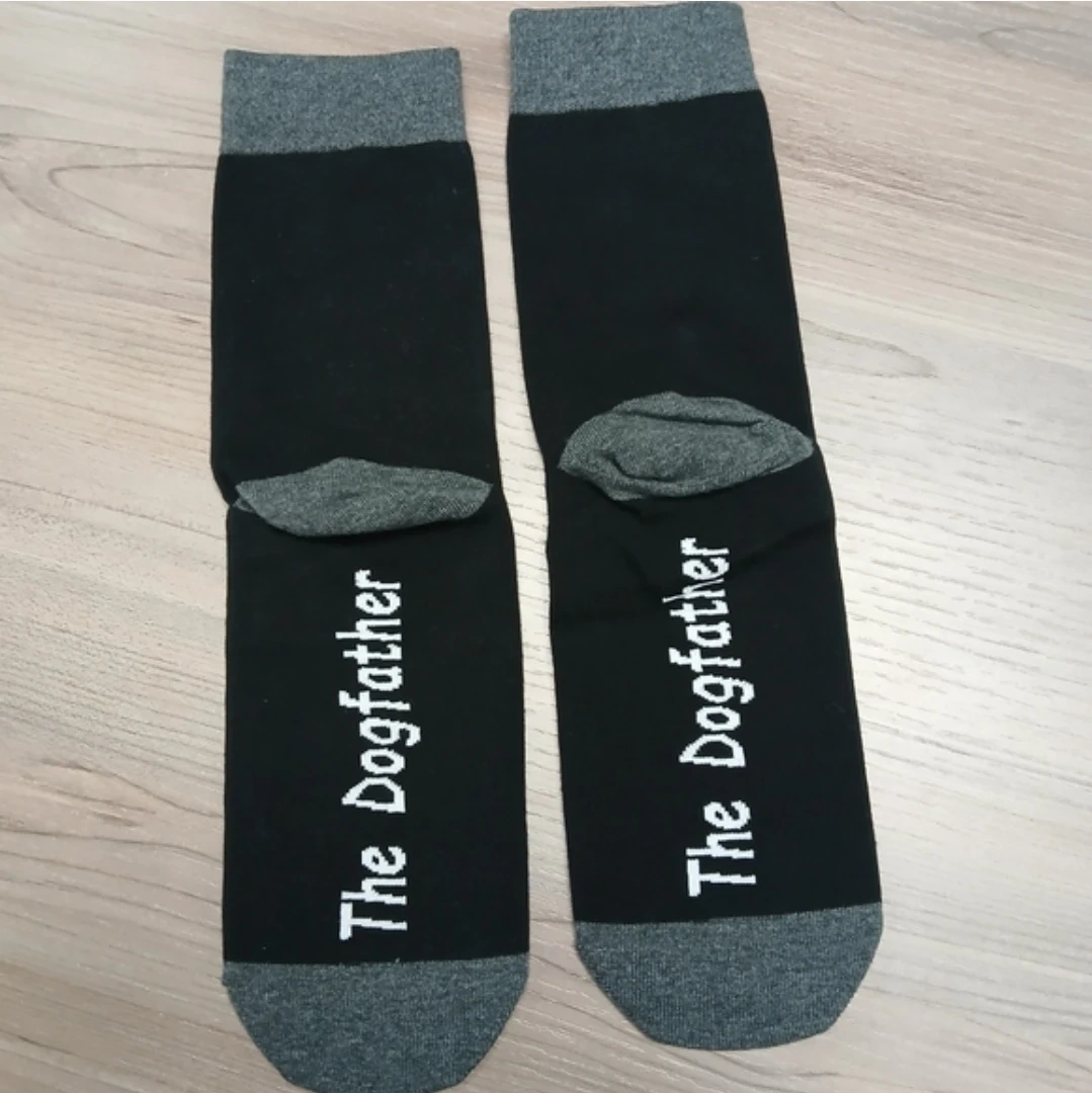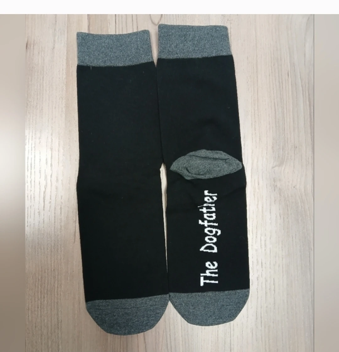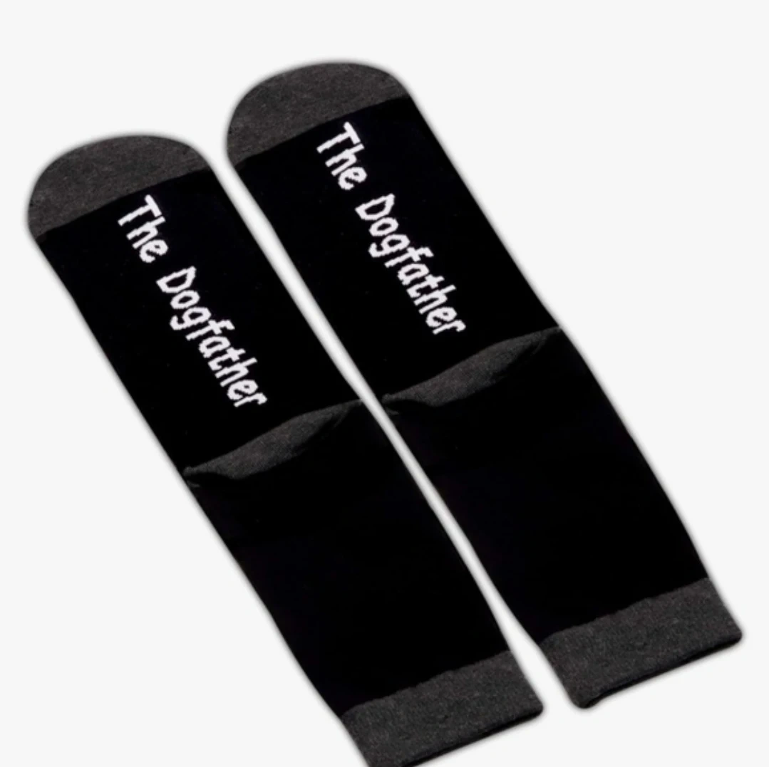 Black and grey mid calf socks that say "dogfather" on the bottom. Excellent for pet / dog owners, or just for fun! Can even be used casually as they look like normal black socks without putting up your feet