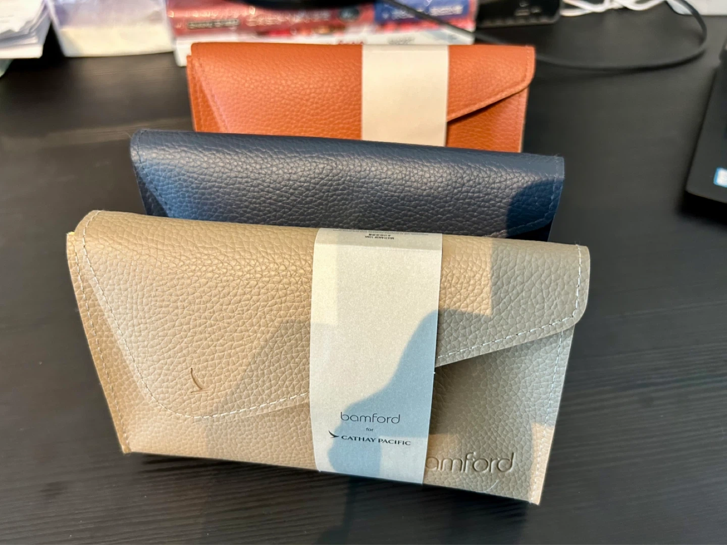 These are the luxurious Bamford for Cathay Pacific business class flight luxury amenity kits. Beautiful neutral colored pebbled leather and brand new amenity set inside. Elevate your next trip with this fancy addition!