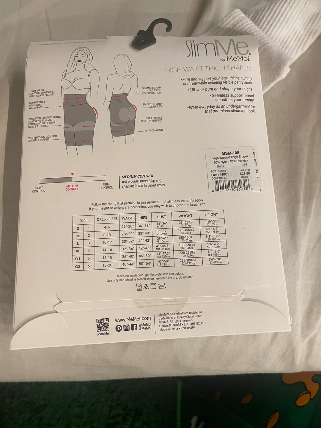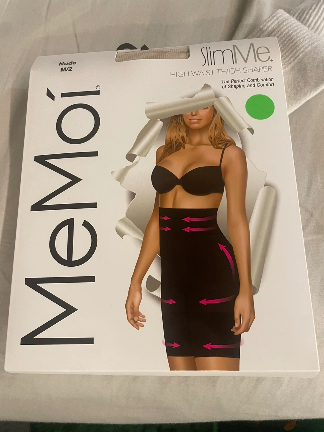 This is a SlimMe brand High Waist Thigh Shaper in size Medium/2 and Nude color. It's made of 90% Nylon and 10% Spandex. It provides firm control for smoothing and shaping targeting tummy, waist, and thighs.
