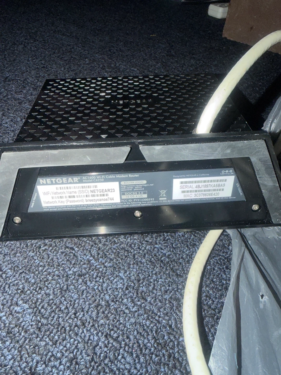 This is a NETGEAR AC1600 WiFi Cable Modem Router. It's a black modem router. Includes power adapter and ethernet cable.