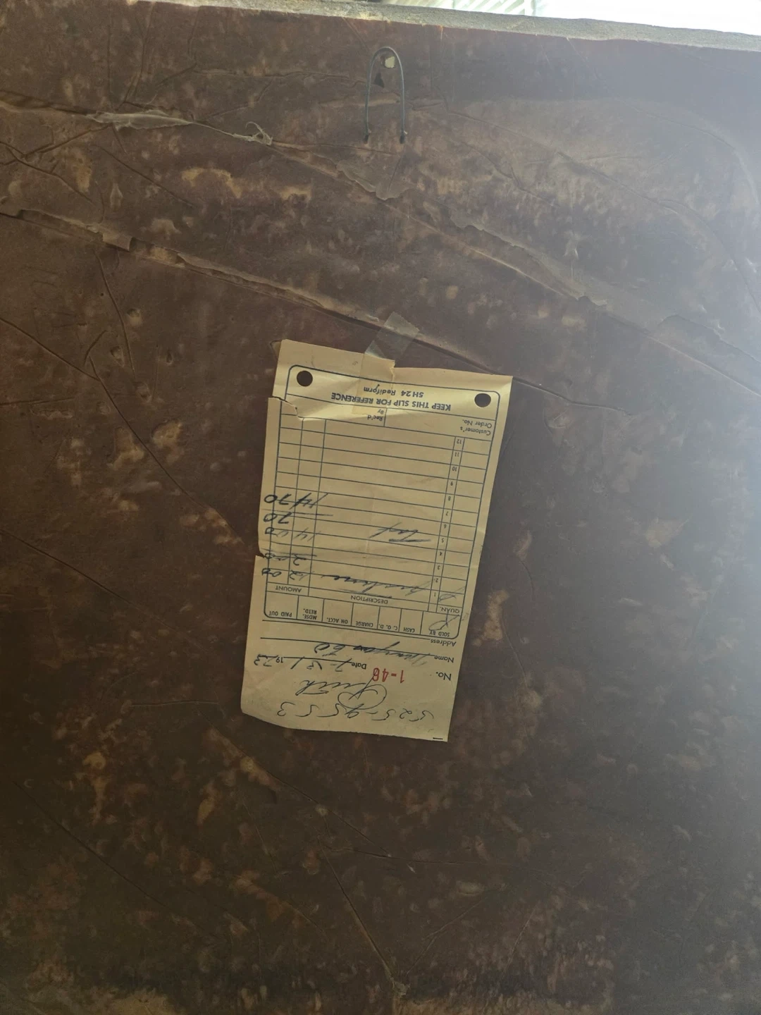 This is an ornate wall plaque featuring an embossed figure of a person on horseback. It has a detailed, textured border. The back shows a faded label with handwritten notes and a date. It's a unique decorative piece.