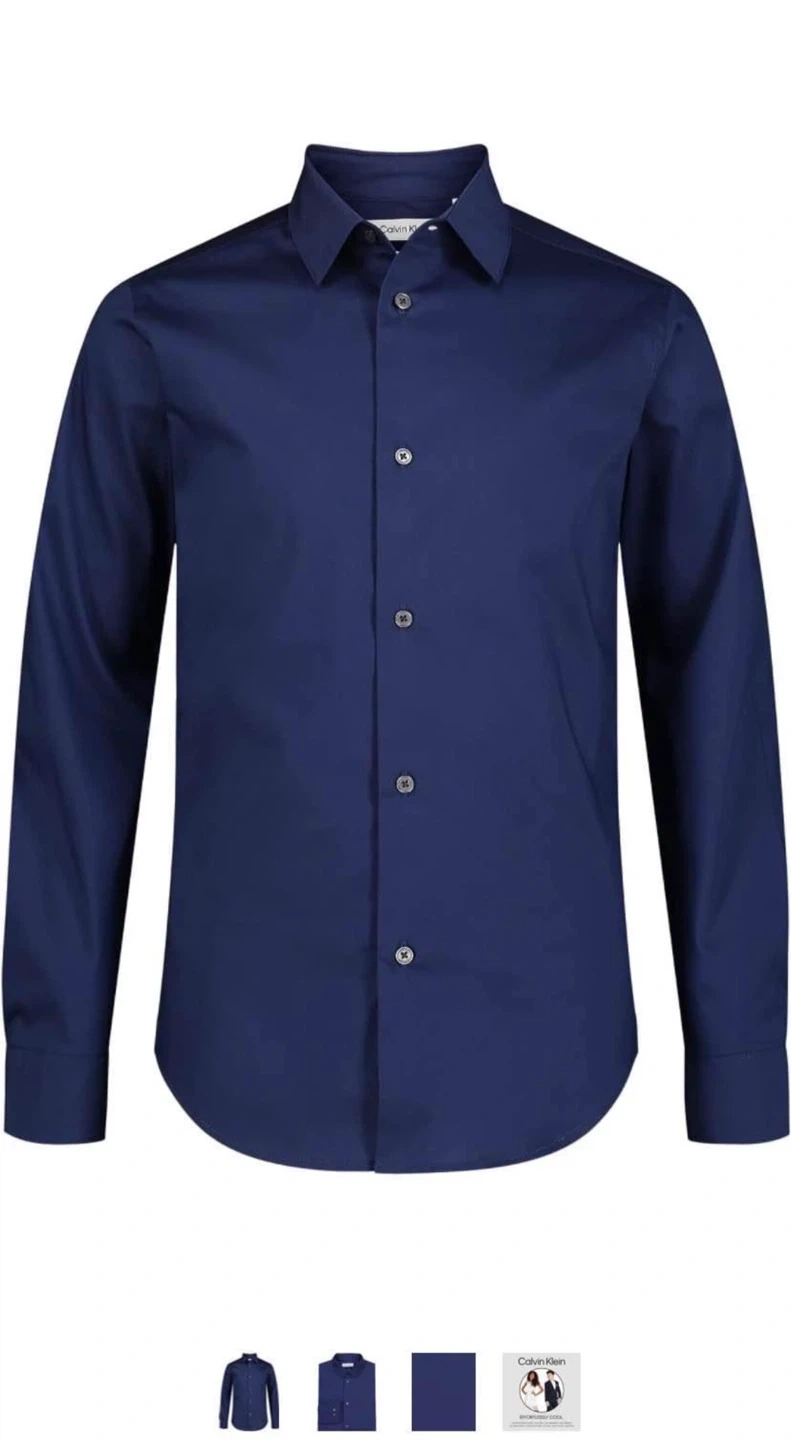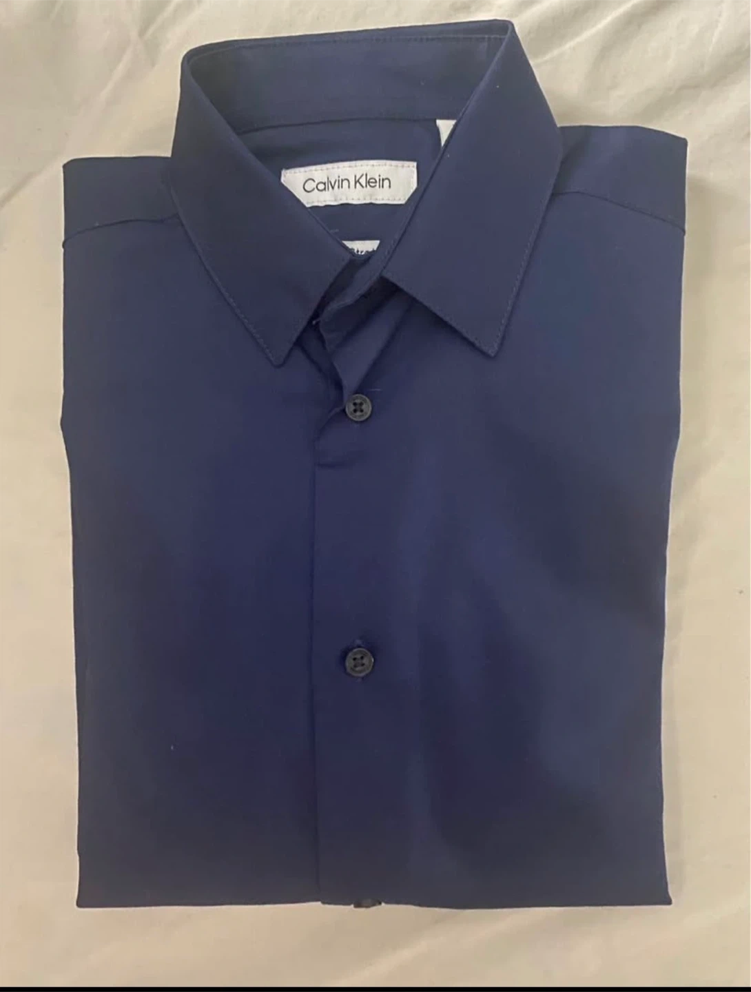 This is a navy blue long-sleeve dress shirt from Calvin Klein. It features a button-front closure and buttoned cuffs. It's a slim fit style. Size 10.