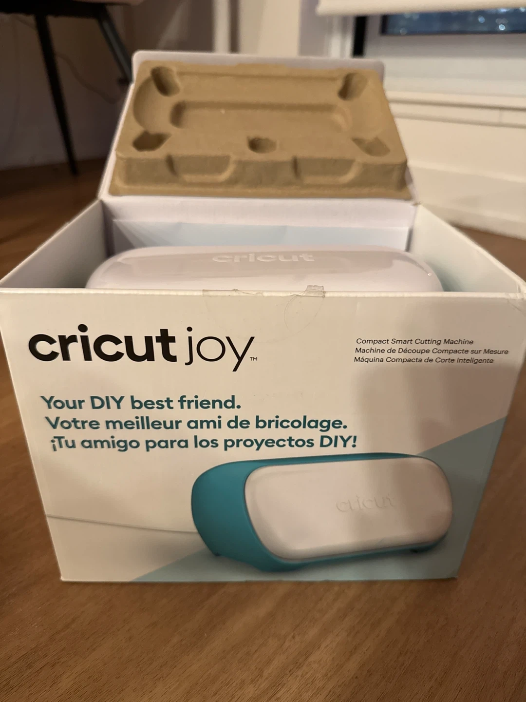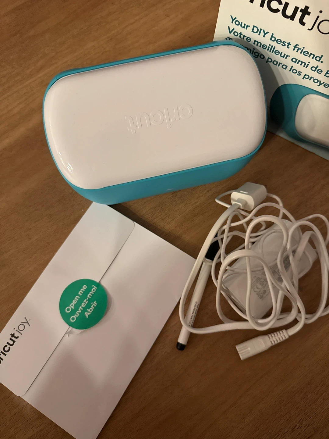Cricut Joy, a compact smart cutting machine perfect for DIY projects. It comes with a power adapter and a pen. This machine is designed for quick and easy crafting at home.