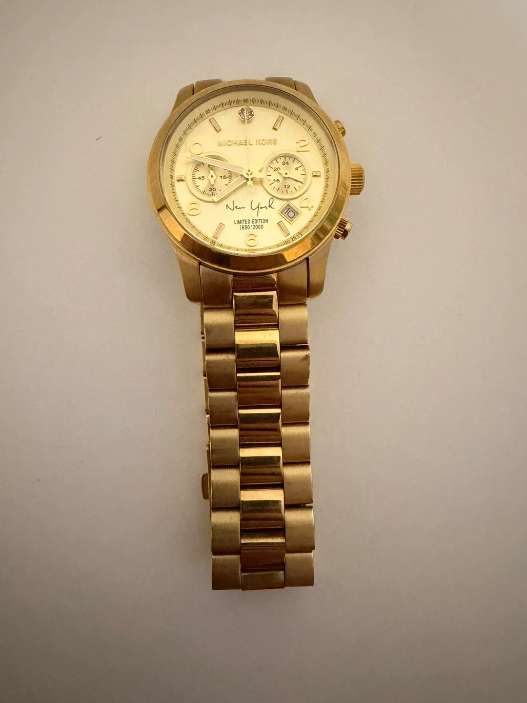 This Michael Kors chronograph watch features a gold-tone stainless steel band and case. It's a limited edition model with "New York" displayed on the face. The watch is water-resistant up to 10 ATM.