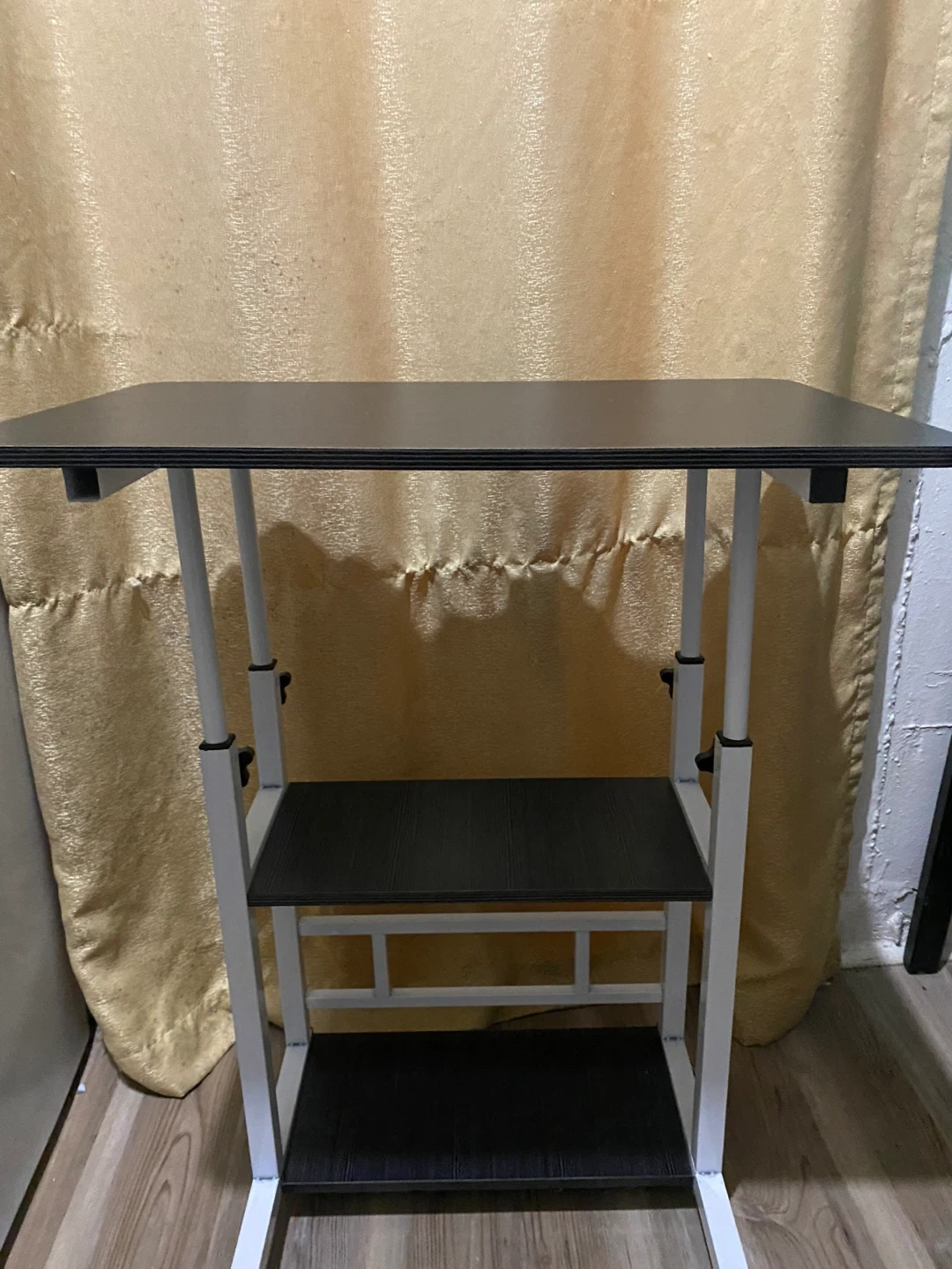 This portable desk has a black wood grain top with white metal legs. It features two shelves for extra storage and wheels for easy mobility. The height is adjustable with side knobs.