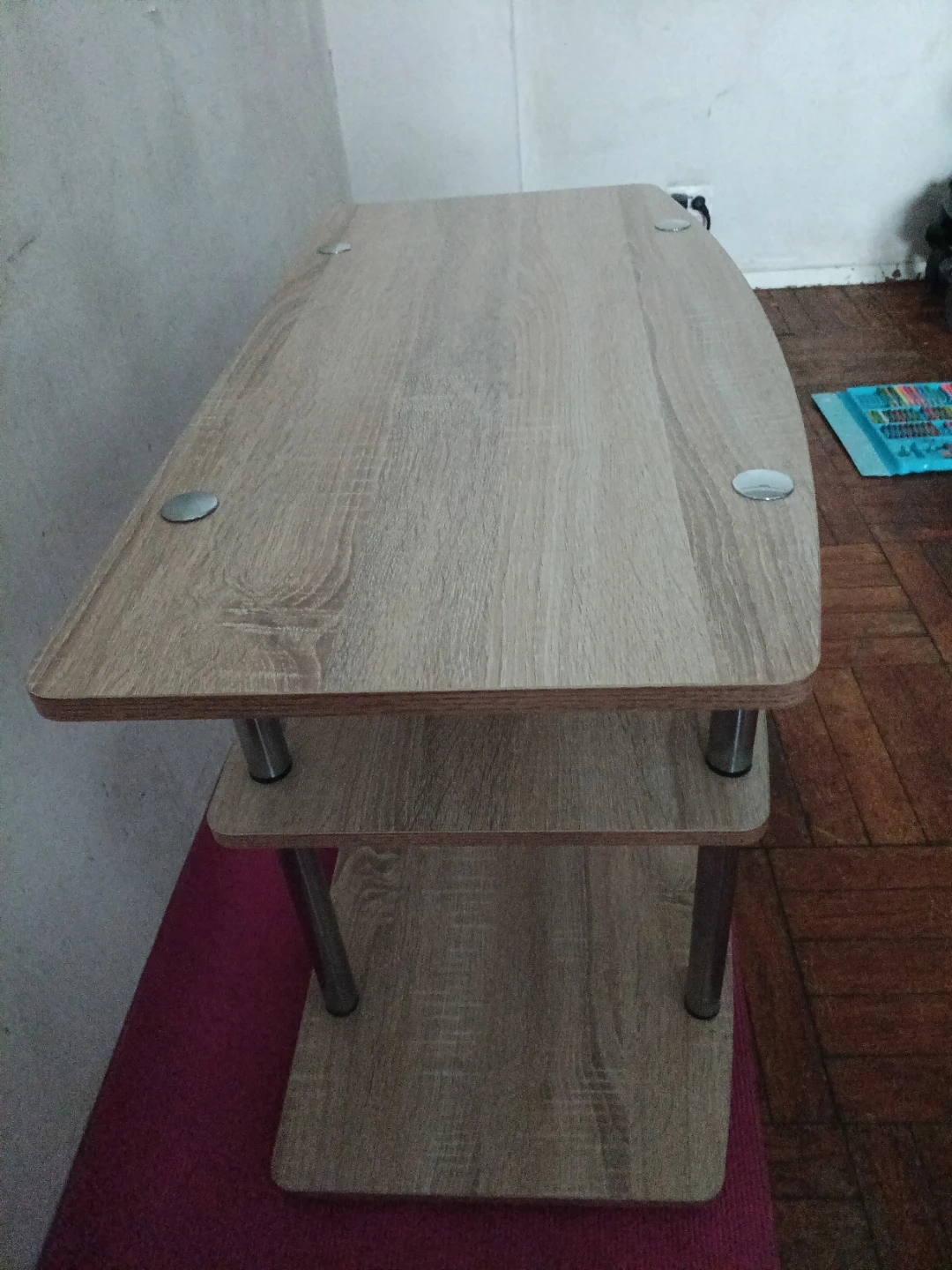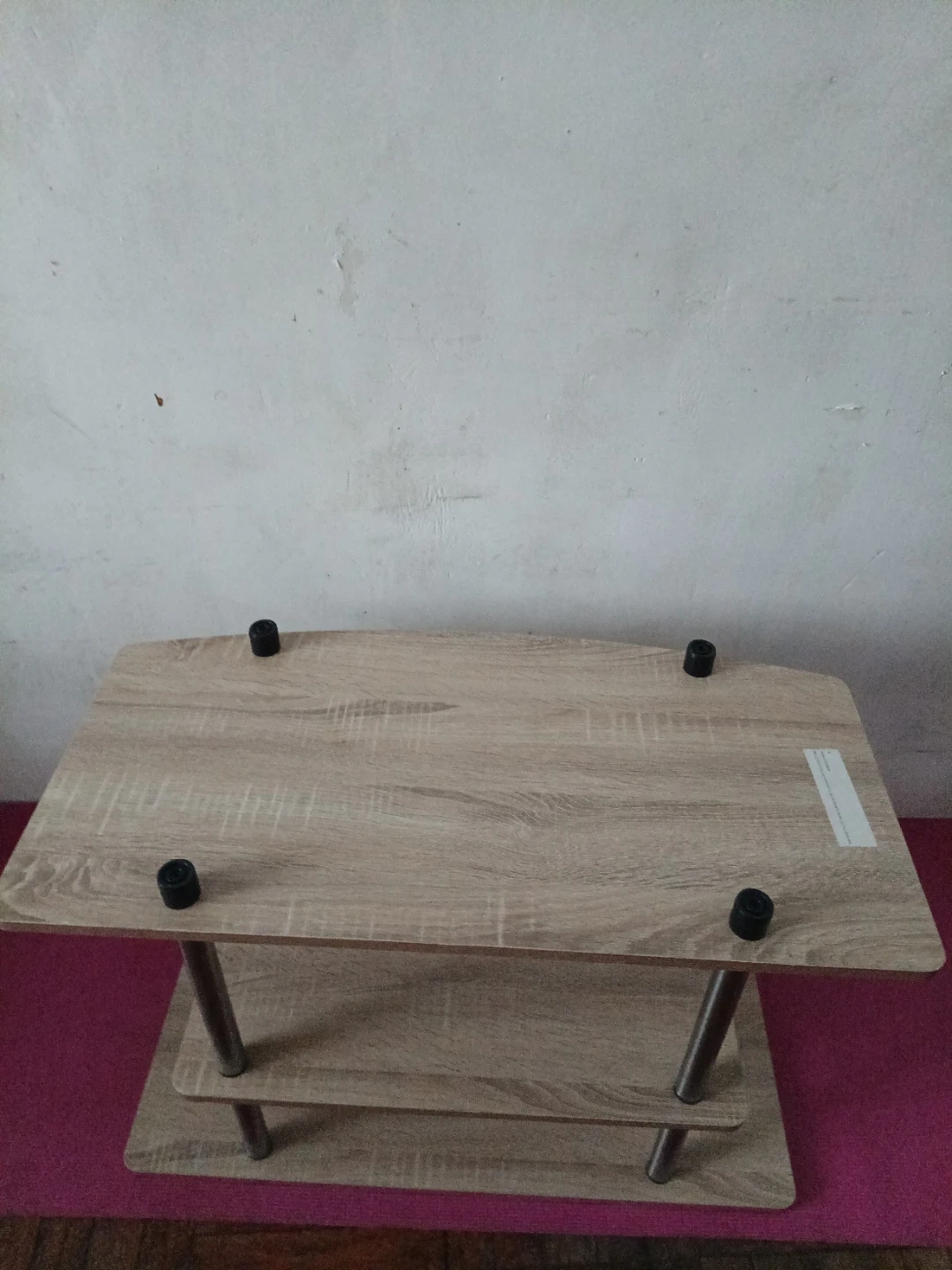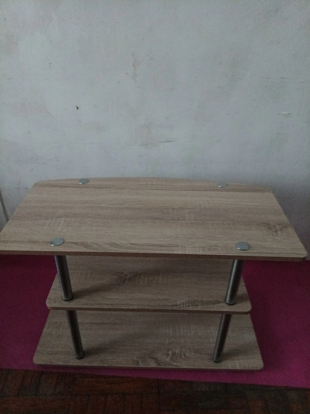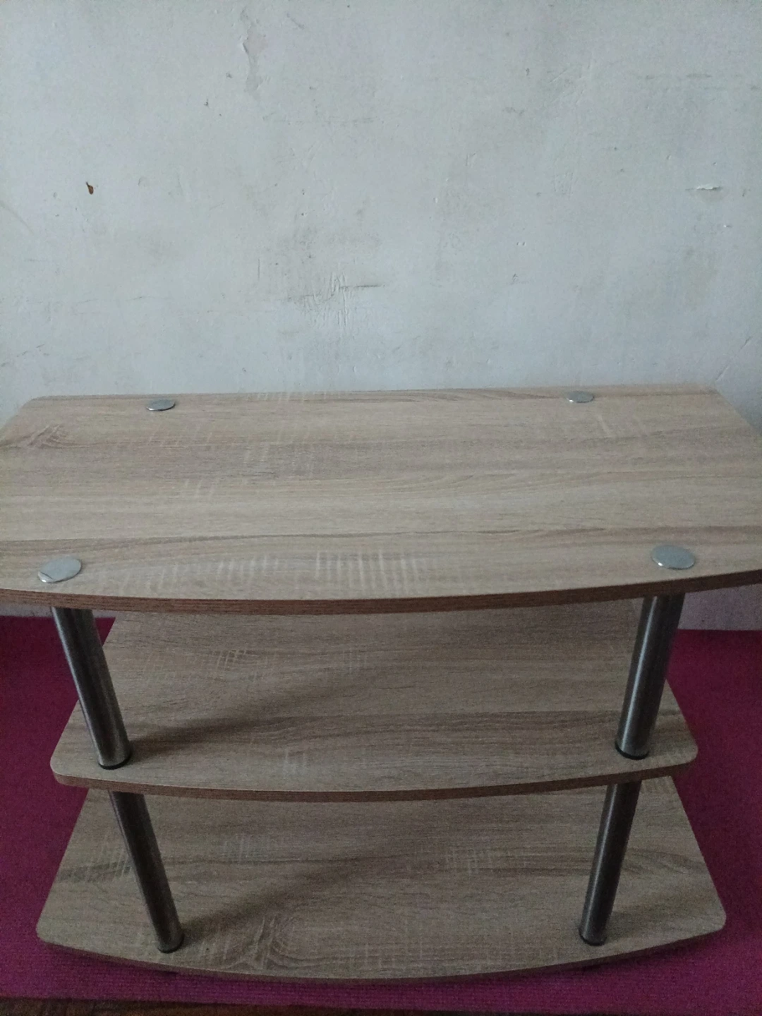 This three -tier TV stand features a light wood grain finish with silver metal legs. It's great for holding your TV and media devices. The shelves offer ample storage space.toes not included lol