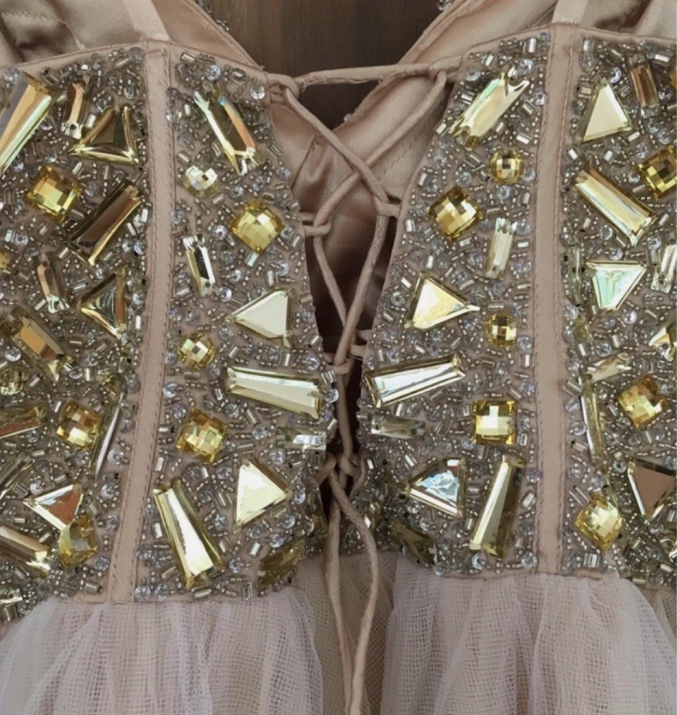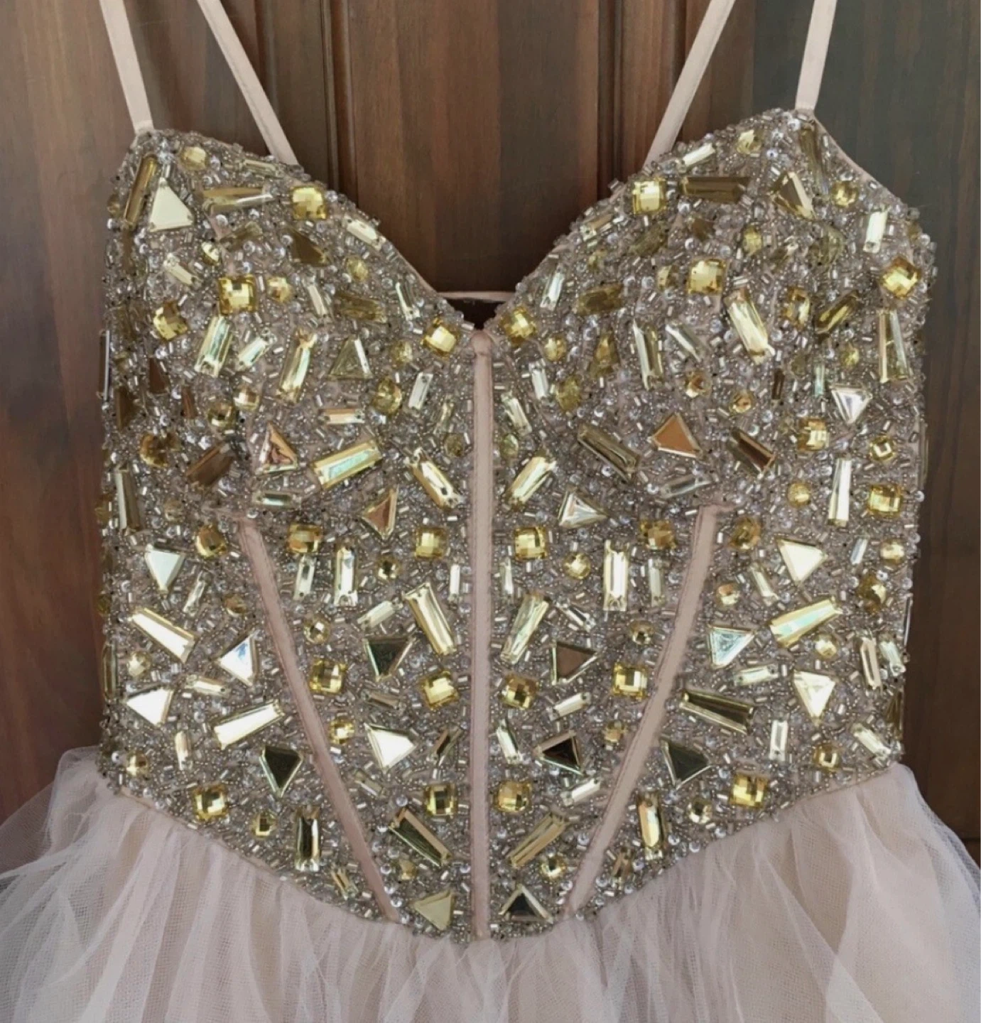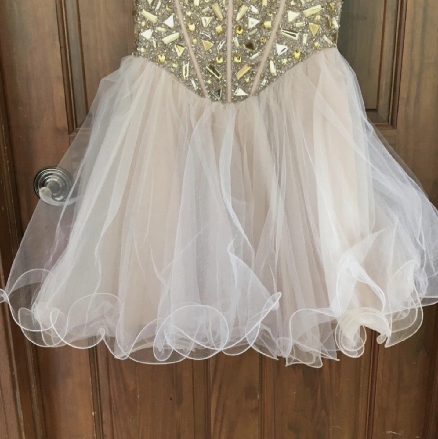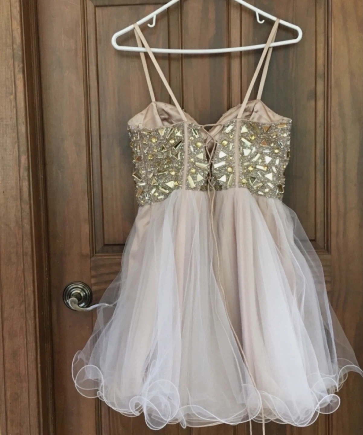 This dress features a dazzling beaded corset bodice with a lace-up back closure. The skirt is made of delicate, layered tulle with a ruffled hem. It's perfect for special occasions like parties or dances!