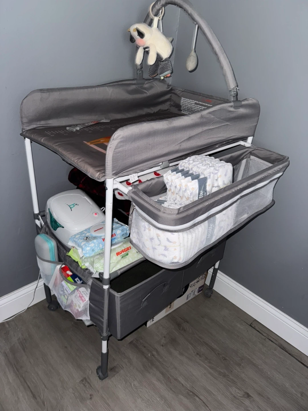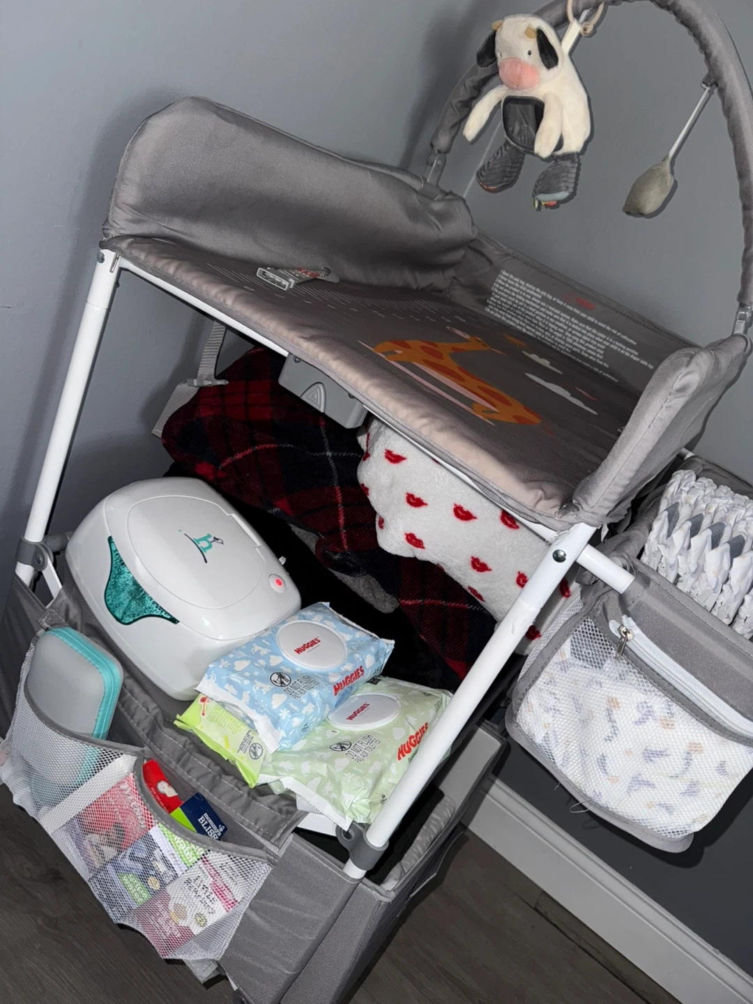 This is a portable changing station with multiple storage compartments. It includes a changing pad and a mobile toy bar. It's made of durable fabric and metal frame. It doesn't include any items; it's just how I have it organized. You can even set up his bathtub to give him a bath.