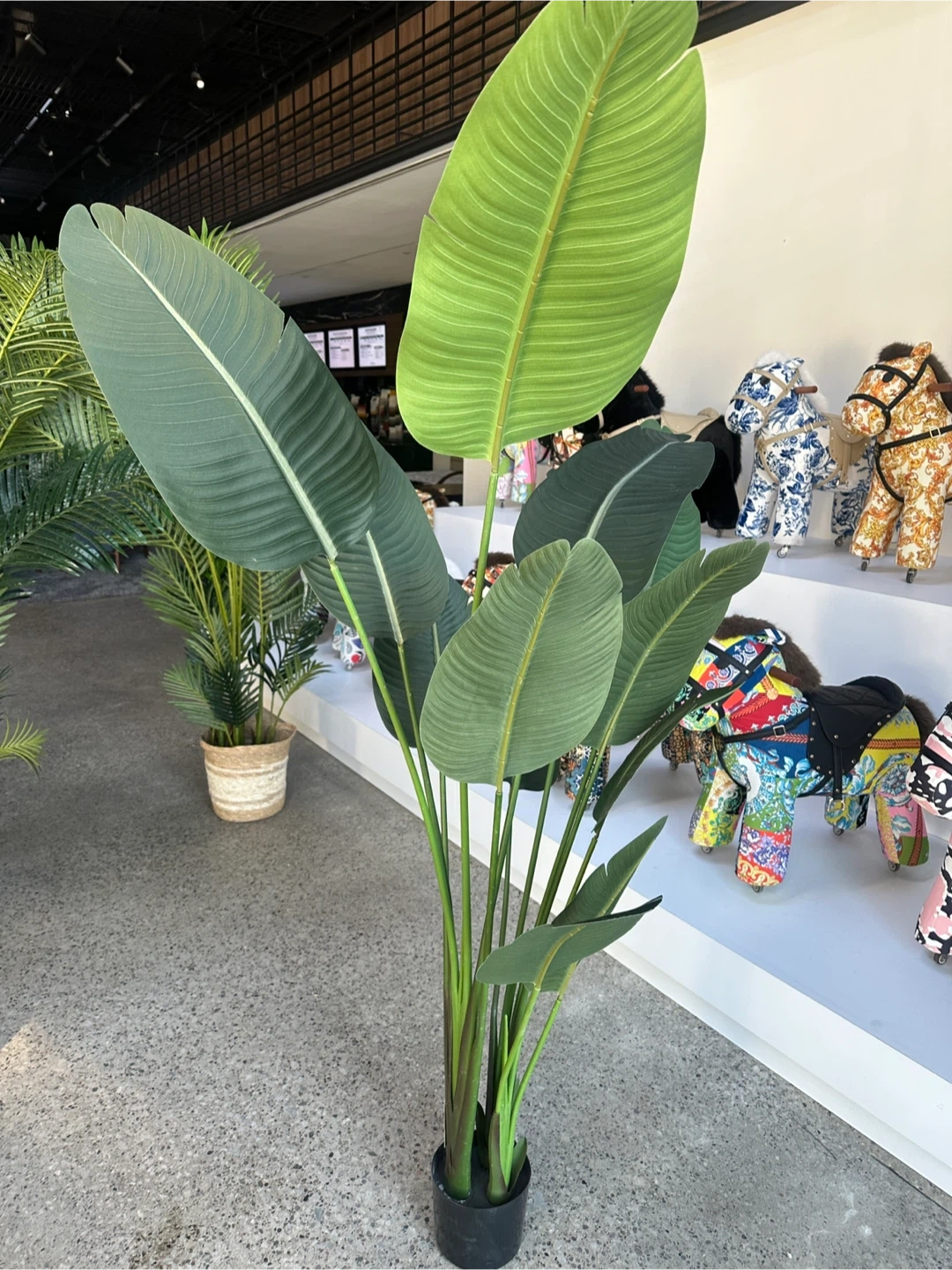This artificial palm plant brings a touch of greenery to any space. It's designed to look realistic with vibrant green leaves. The plant comes in a simple black pot, ready for display.