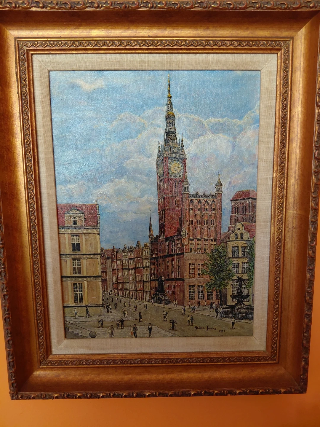 This is a framed oil painting depicting an old European town square with a prominent clock tower. People are shown strolling along the street, and there's a fountain on the right side. The painting is signed by the artist 'Dariusz Jaros' and dated '1982'. It's framed in a decorative gold-colored frame.