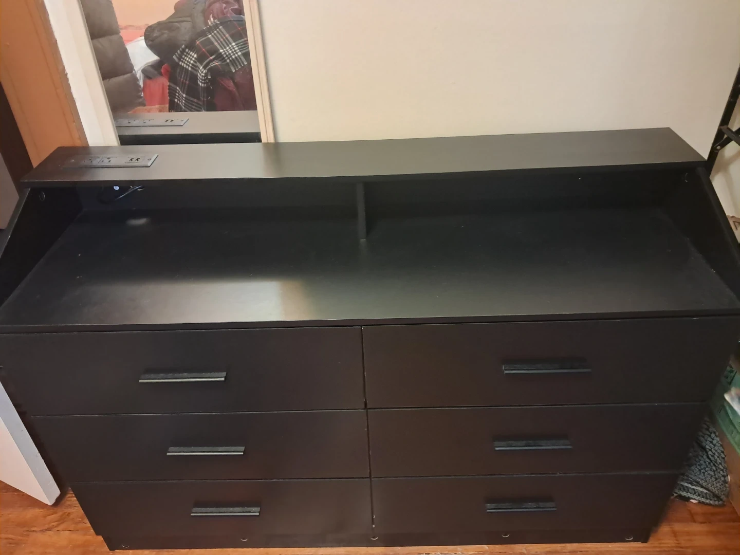 This black dresser offers six spacious drawers for storage. It includes a convenient built-in charging station with 2 AC outlets and 2 USB ports. The power cord is 4.9 feet long.