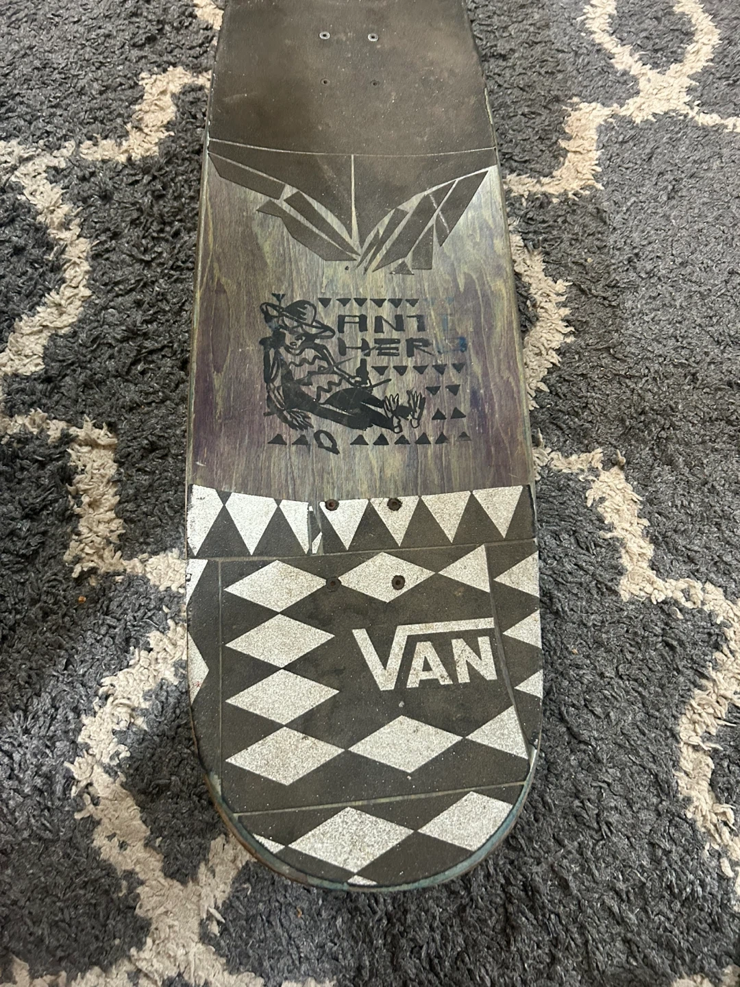 This is an Anti Hero skateboard deck featuring Vans grip tape. The deck has a graphic design and is made for skating. It's ready for your next session!