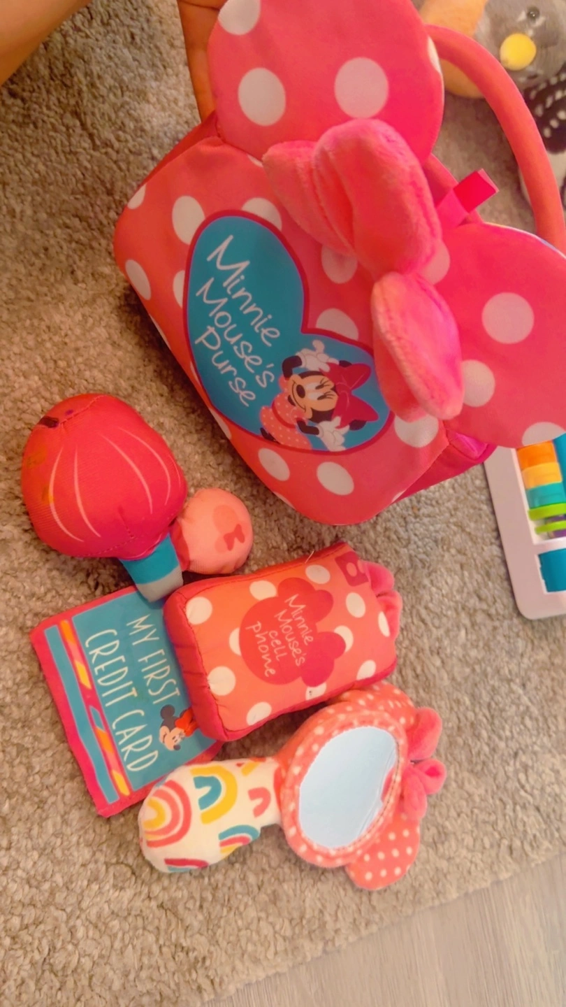 A cute Minnie Mouse toy purse, including a mirror and phone. The purse is pink with white polka dots, and includes other matching accessories. Consider using these toys to provide quiet playtime for your little one.