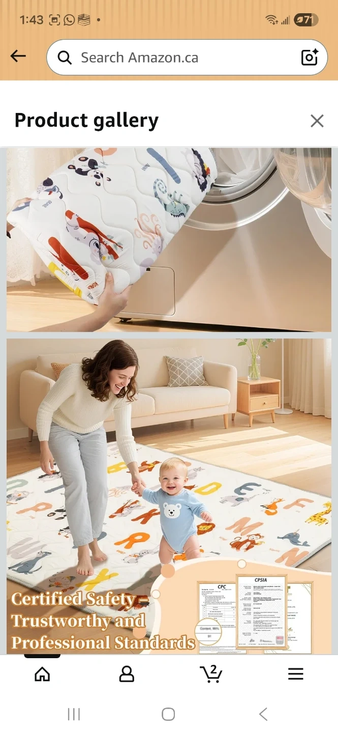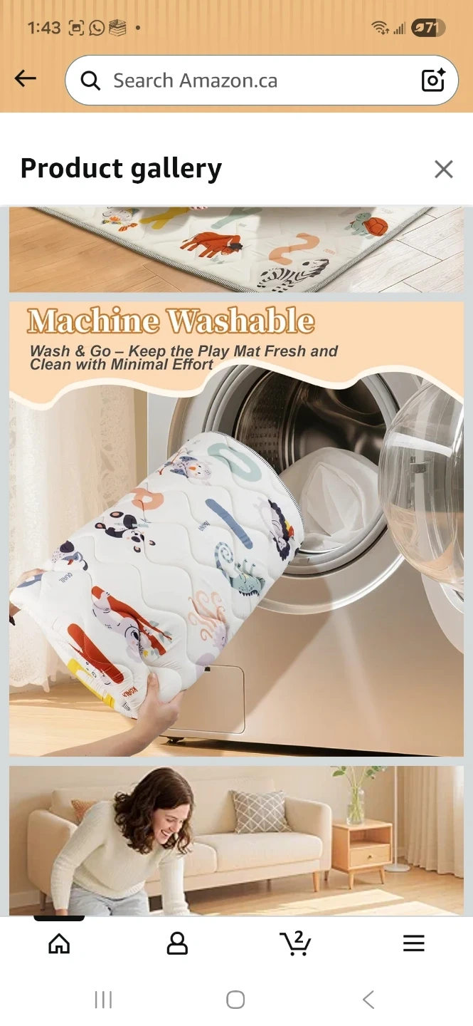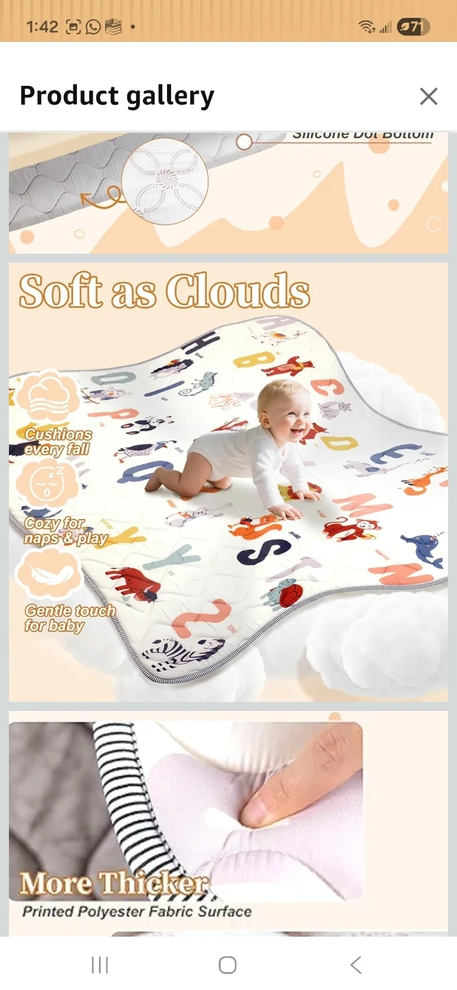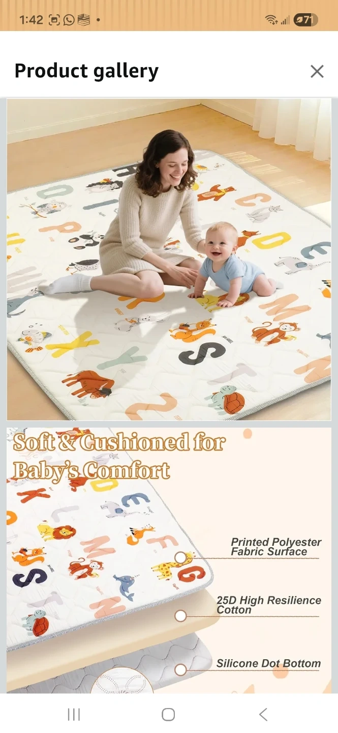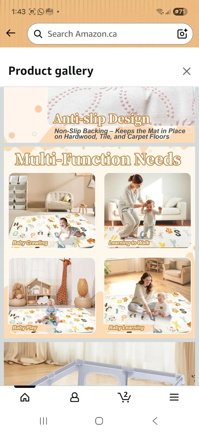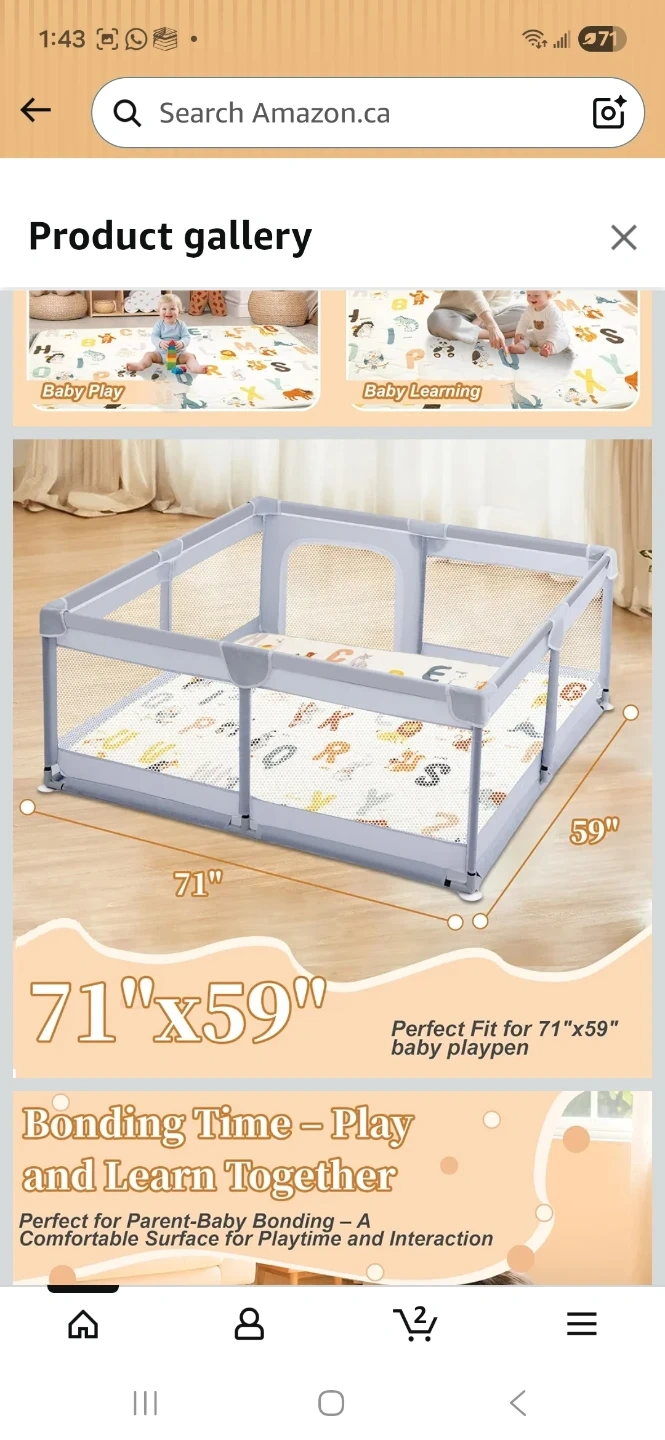 This soft and cushioned play mat is perfect for your baby's comfort. It's made with a printed polyester fabric surface, 25D high resilience cotton filling, and a silicone dot bottom for anti-slip grip. The mat measures 71" x 59". A small cut about 2 inches accidentally when opening the box as seen in pictures, that's why the price. Can easily be sewn up. $25, original over $50. Pu from Cambridge. Brand new.