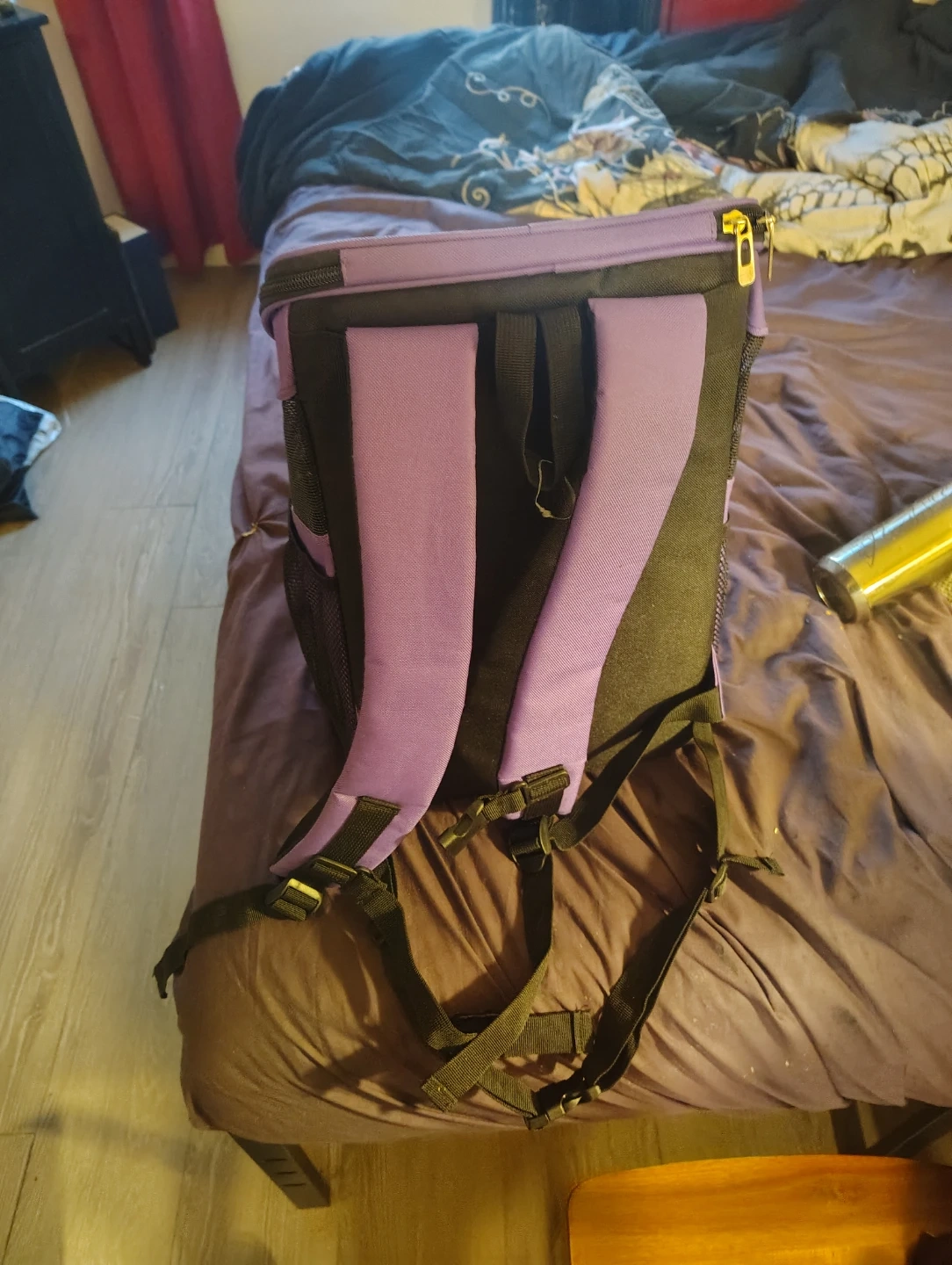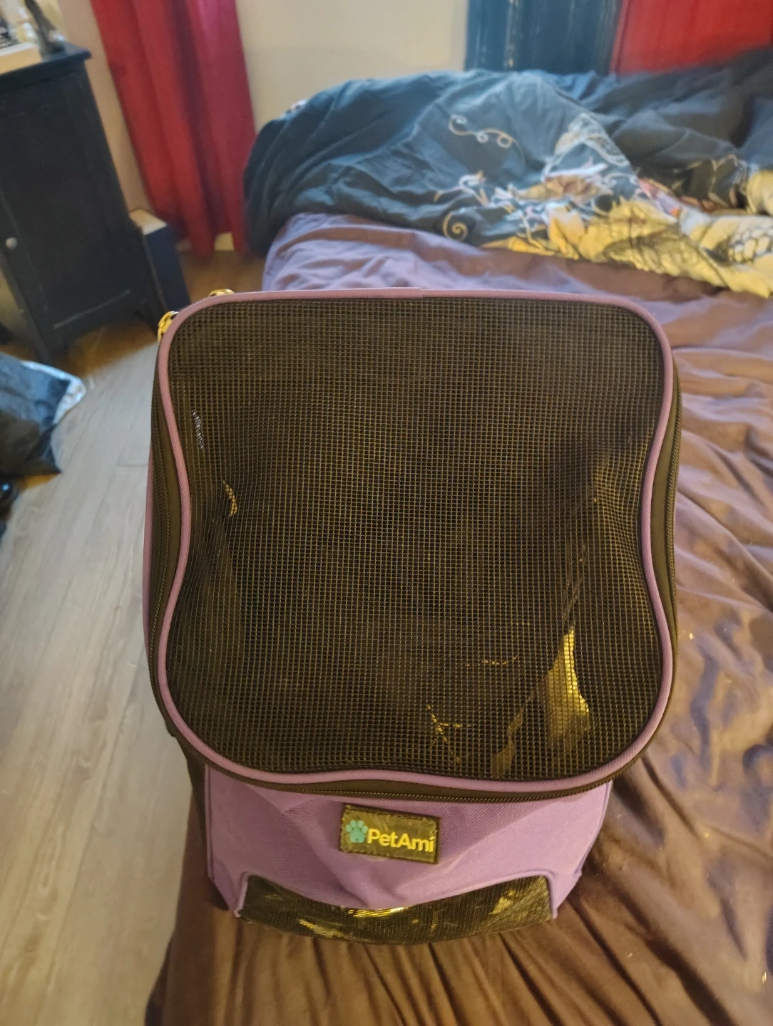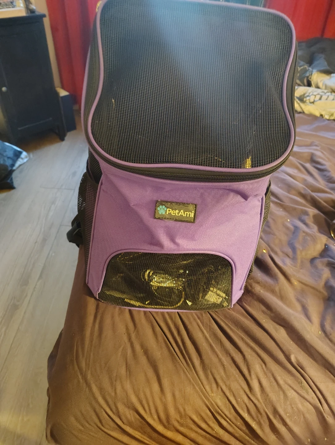 Pet carrier backpack by PetAmi. It's purple and black with mesh ventilation. Features adjustable shoulder straps for comfortable carrying. Great for small pets!