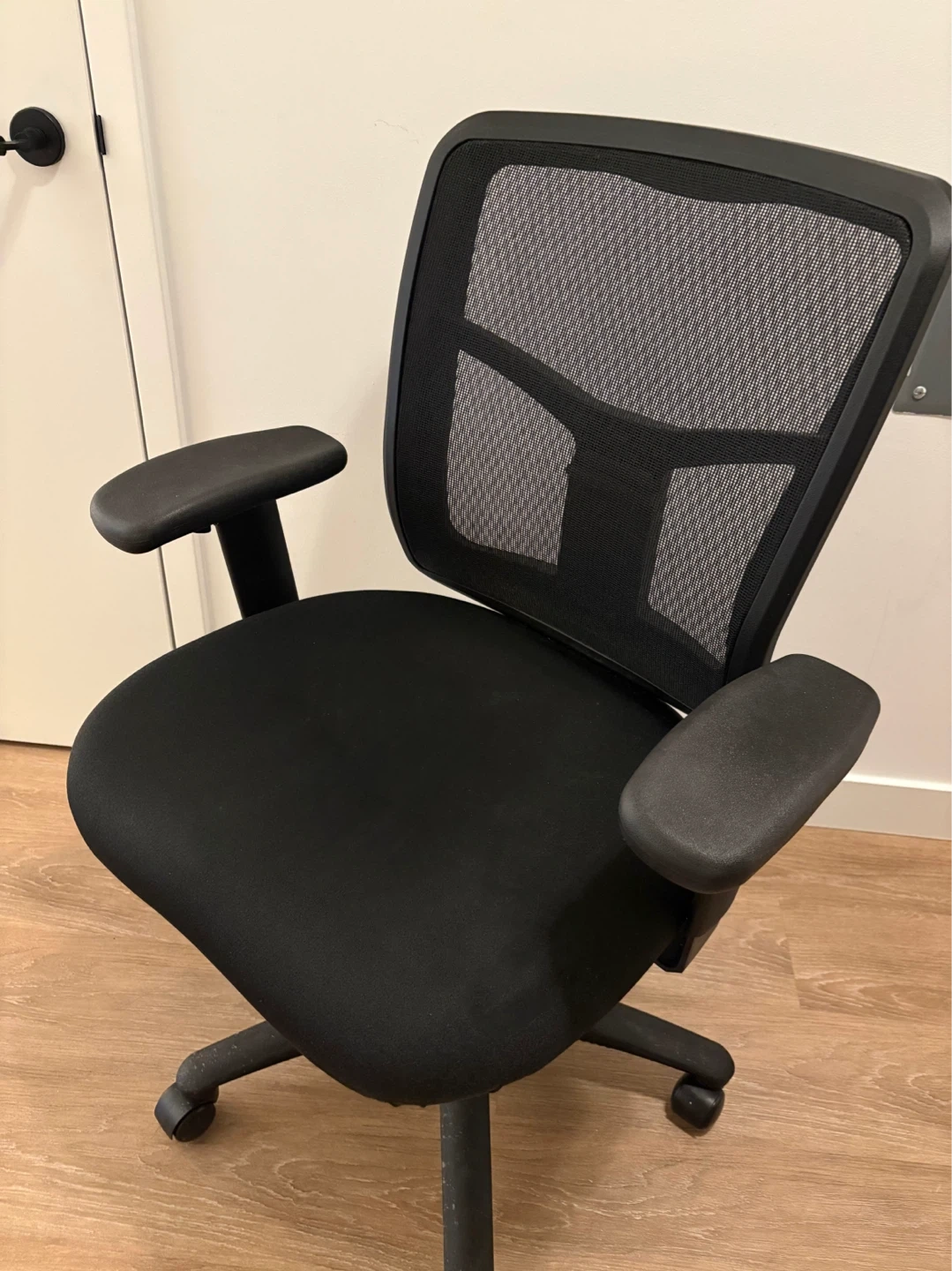This is a black mesh back office chair. It features adjustable armrests and a padded seat. Its sturdy base has five wheels for easy mobility. This chair's design offers good support for long work sessions.