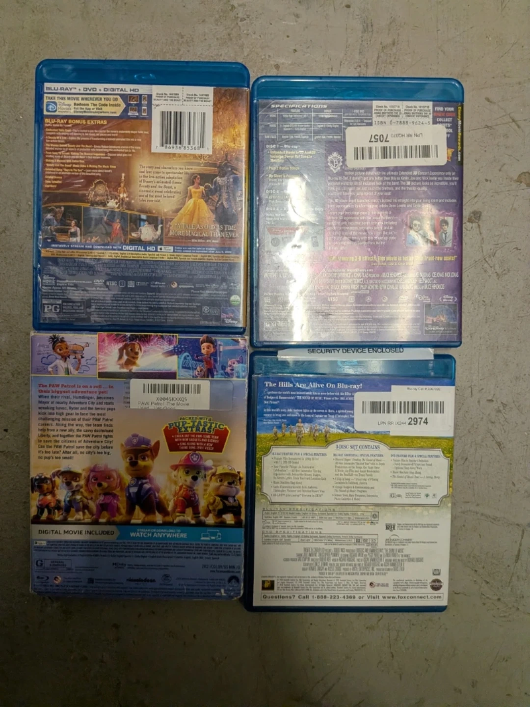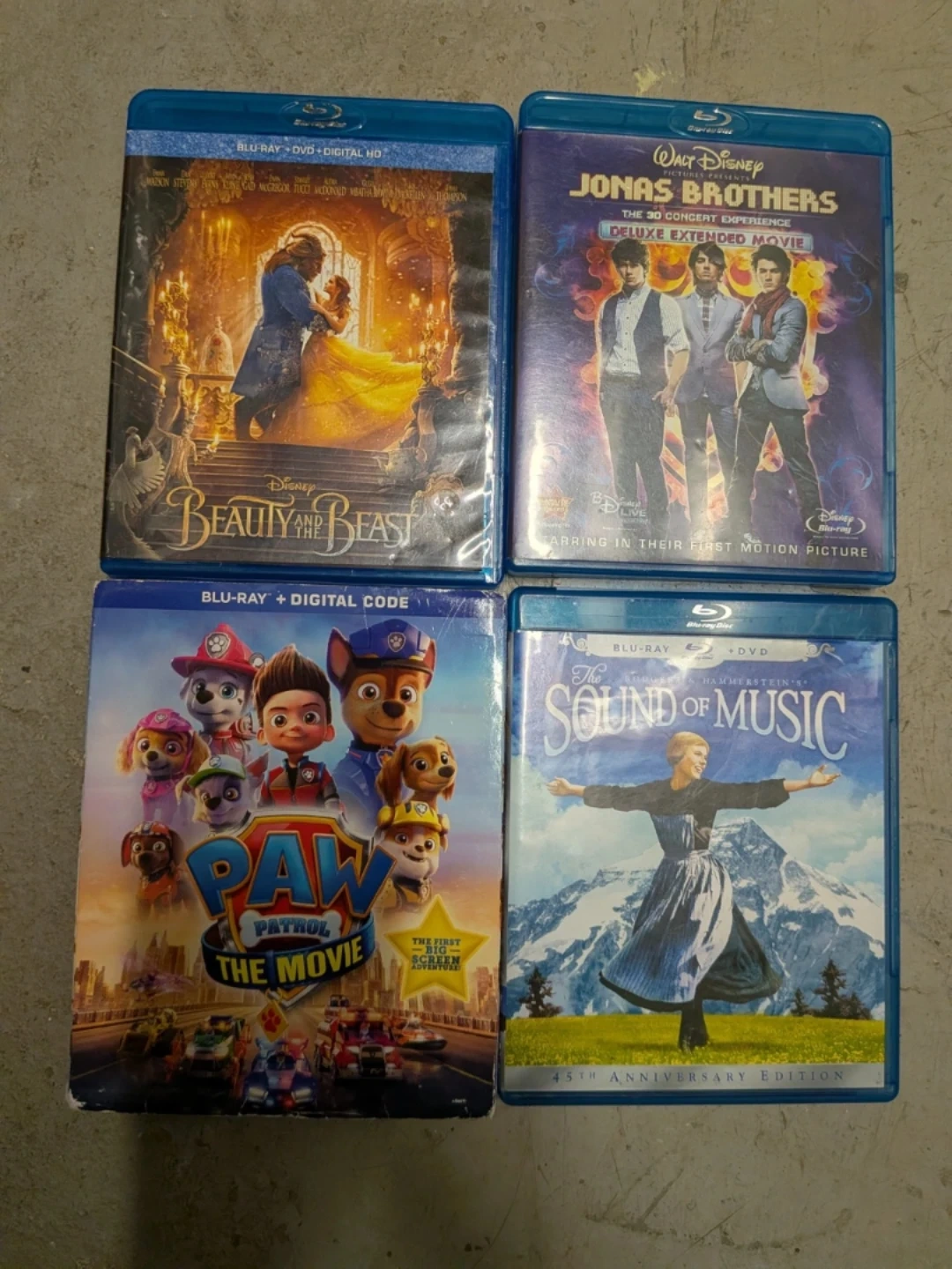 Four Disney Blu-ray movies are included: Beauty and the Beast, Jonas Brothers: The 3D Concert Experience, Paw Patrol: The Movie, and The Sound of Music (45th Anniversary Edition). All discs and cases appear to be in good condition.
