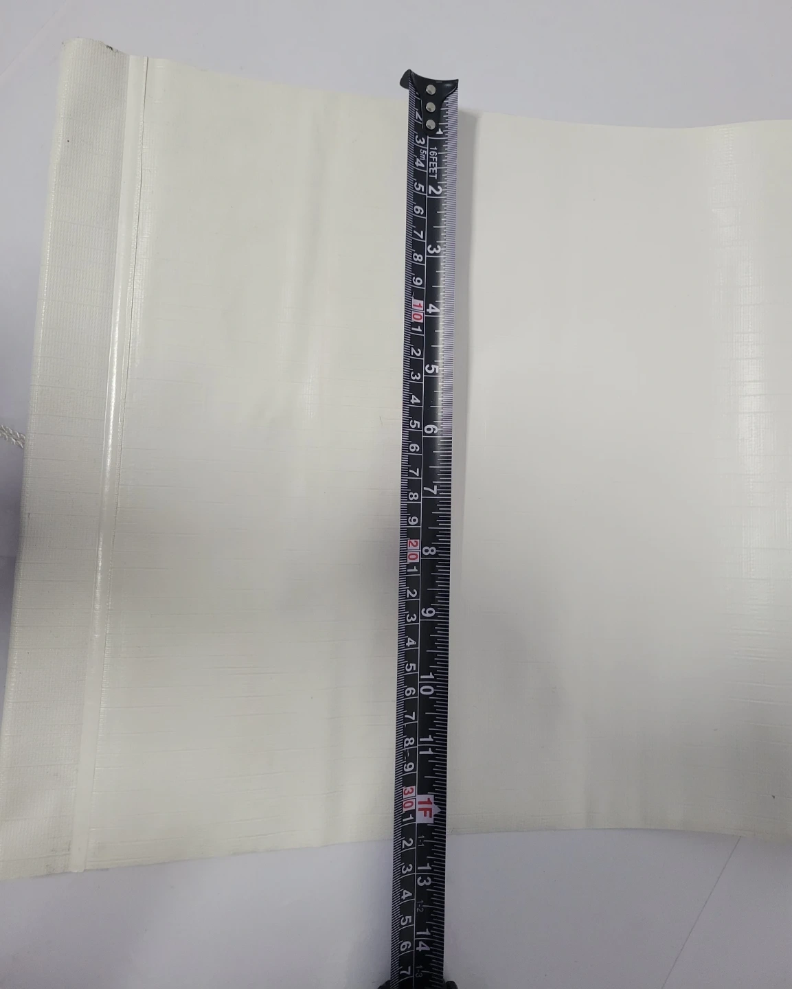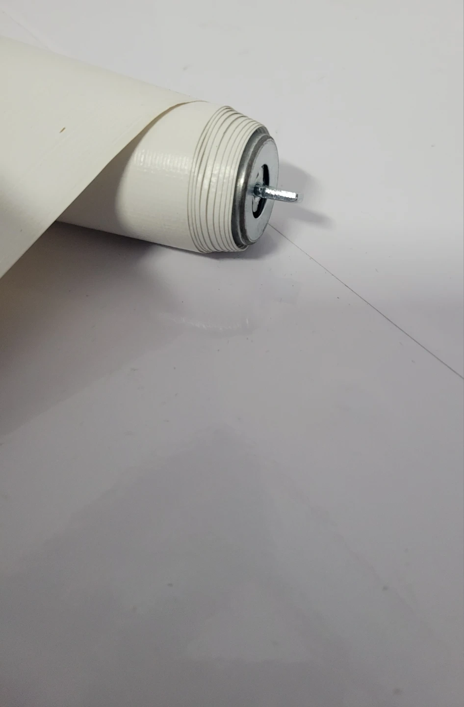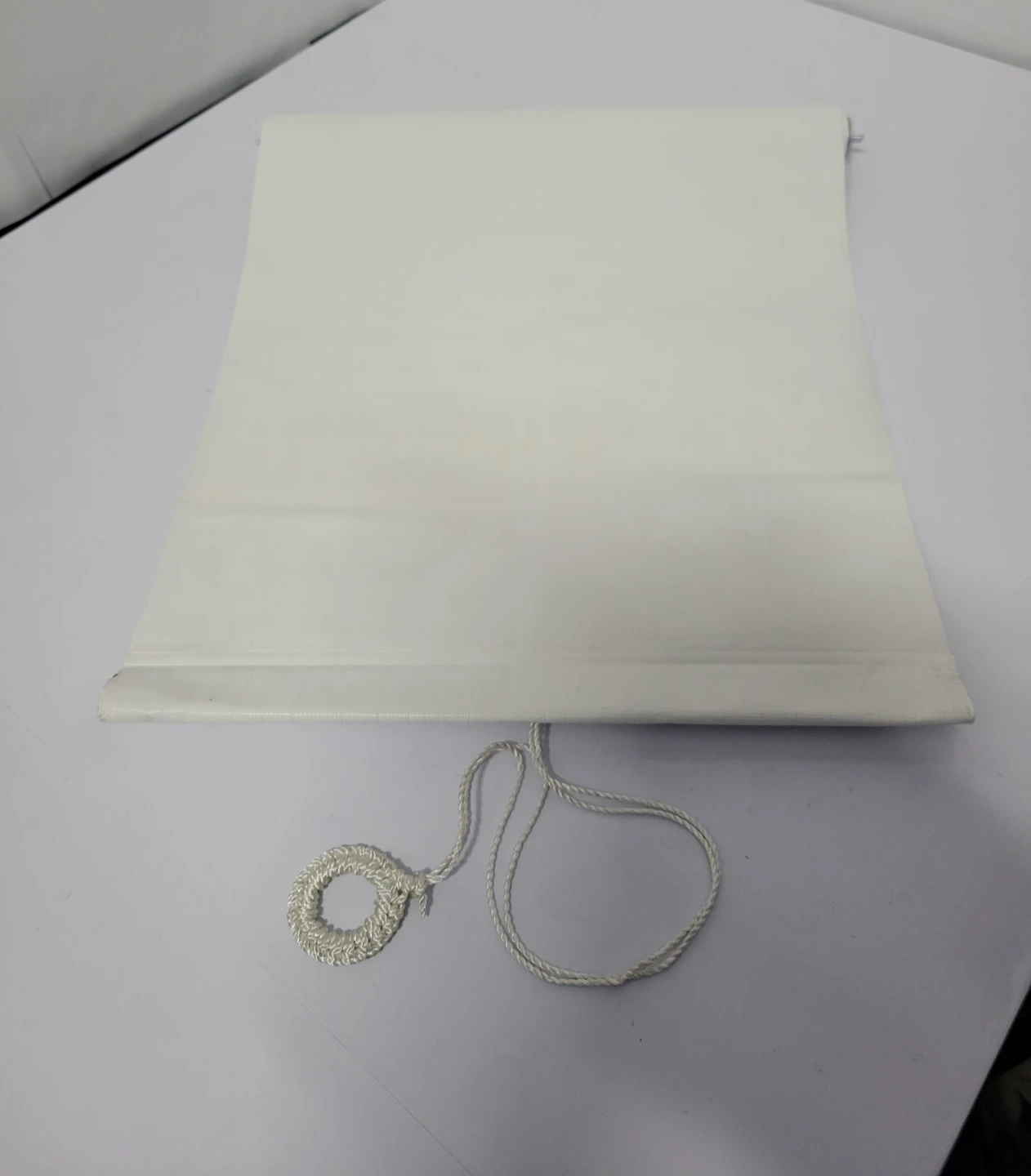 White roller blind with pull cord. Width measures approximately 12.5 inches. This blind's material appears to be a durable vinyl.
