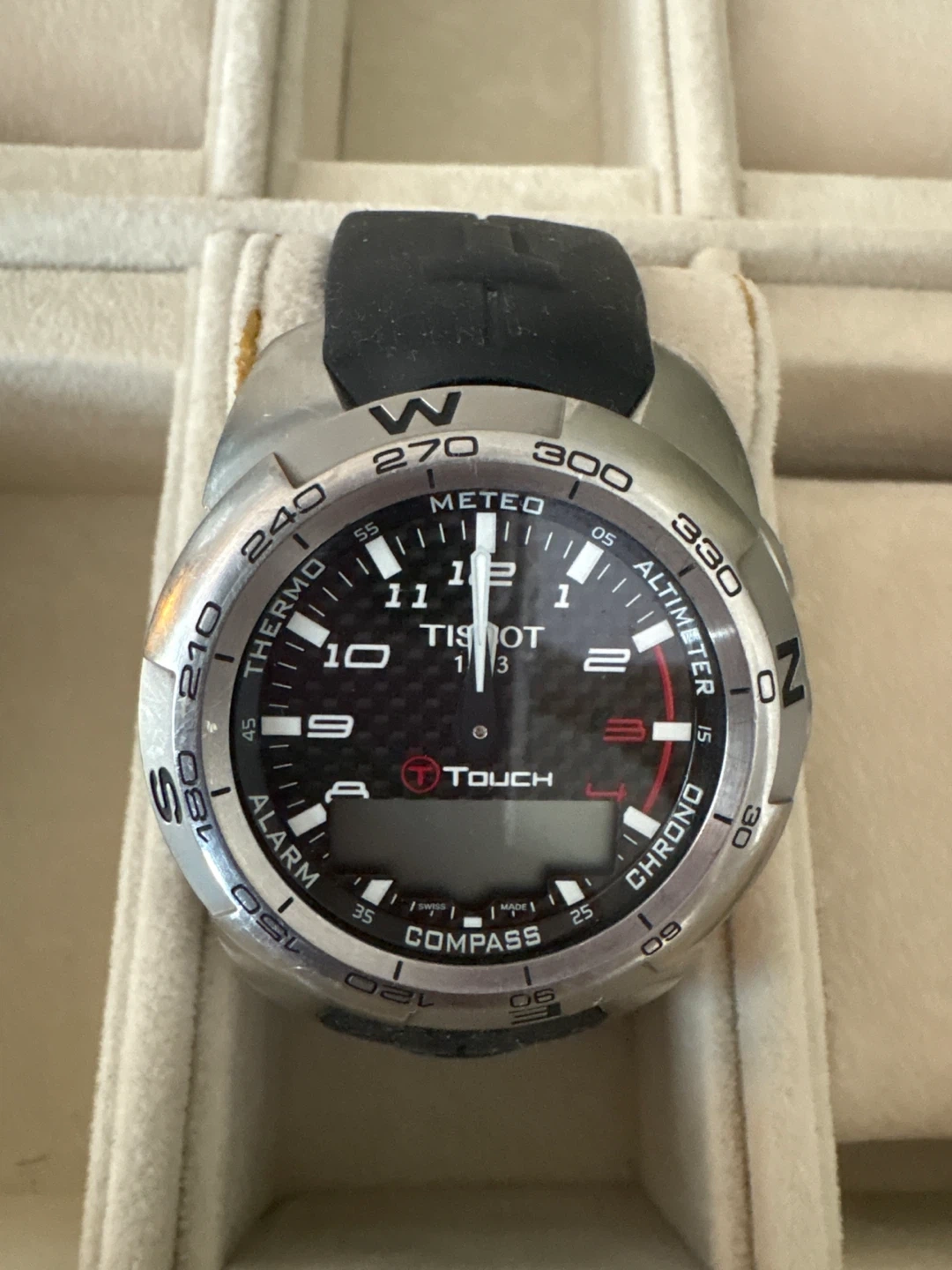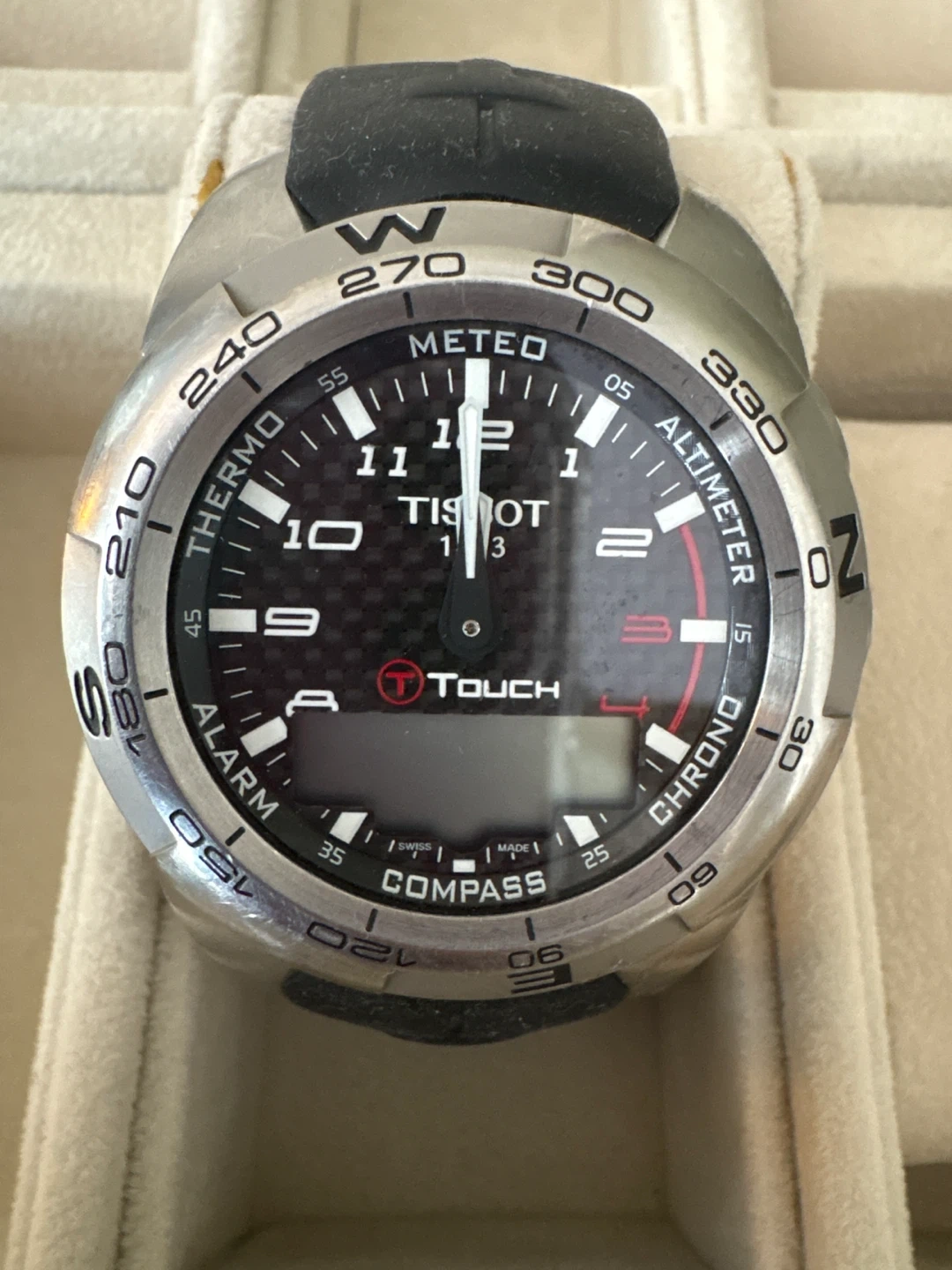 This Tissot T-Touch watch is a multifunction timepiece with a compass, alarm, altimeter, and thermometer. It features a black dial with carbon fibre accents and a stainless steel case. The watch has a black rubber strap and a silver buckle clasp.