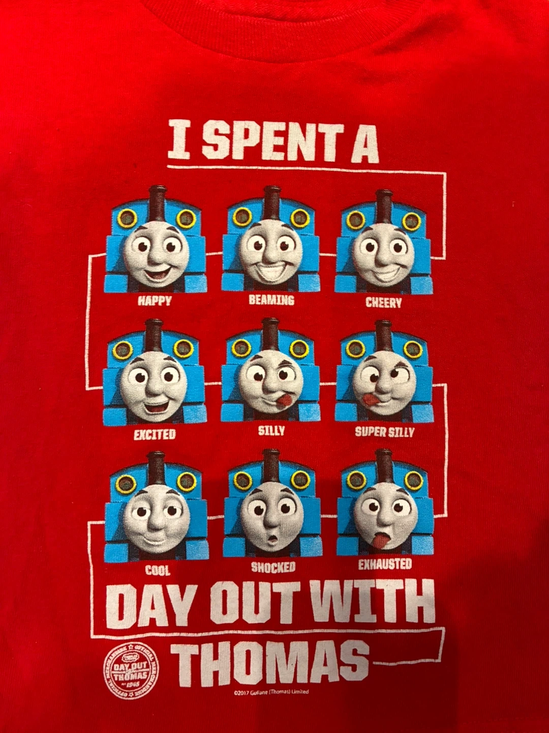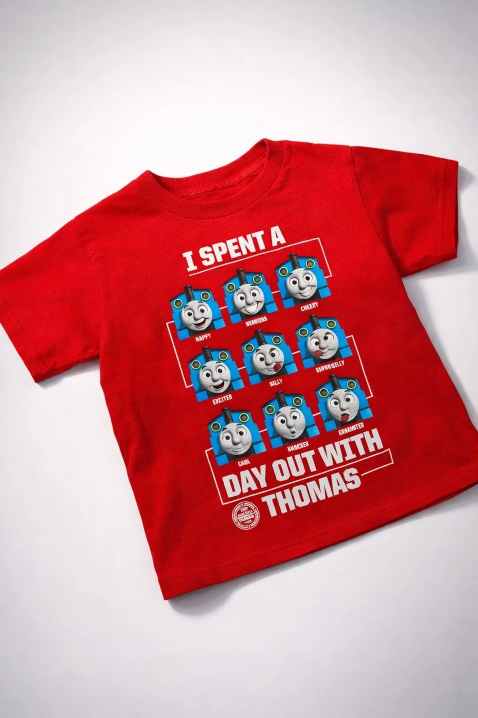 Red t-shirt featuring Thomas the Tank Engine with various expressions like happy, beaming, and excited. It's printed with 'I Spent A Day Out With Thomas'. 100% cotton material.