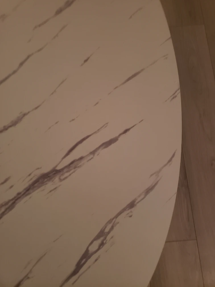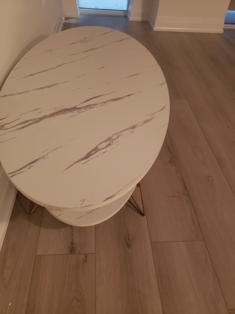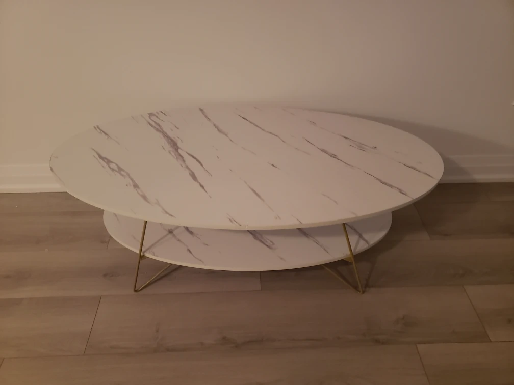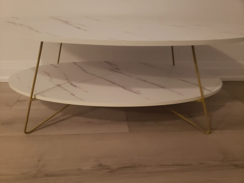 Stylish coffee table. Features two tiers with a marble-look finish. Gold-coloured metal legs. Oval shape. Perfect for living rooms.