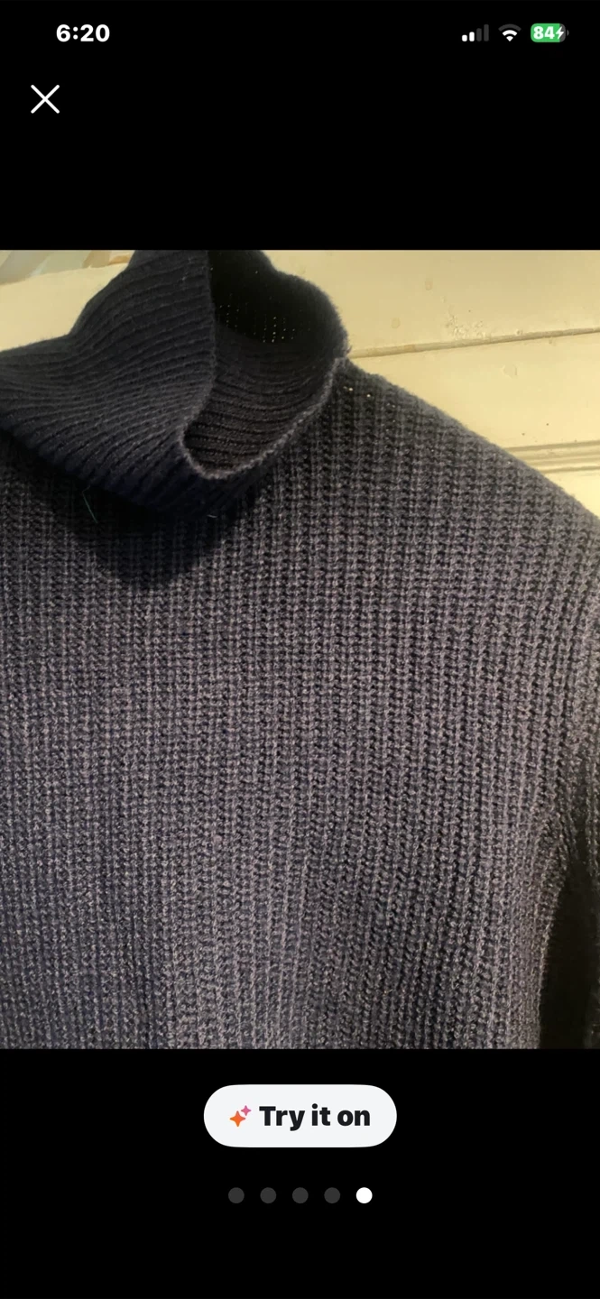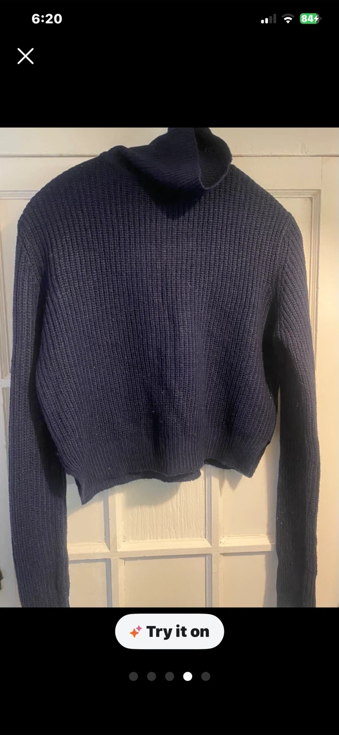 I'm selling a turtleneck cropped sweater. It comes in a dark navy blue colour. It's a great piece to add to your wardrobe for layering or wearing on its own!