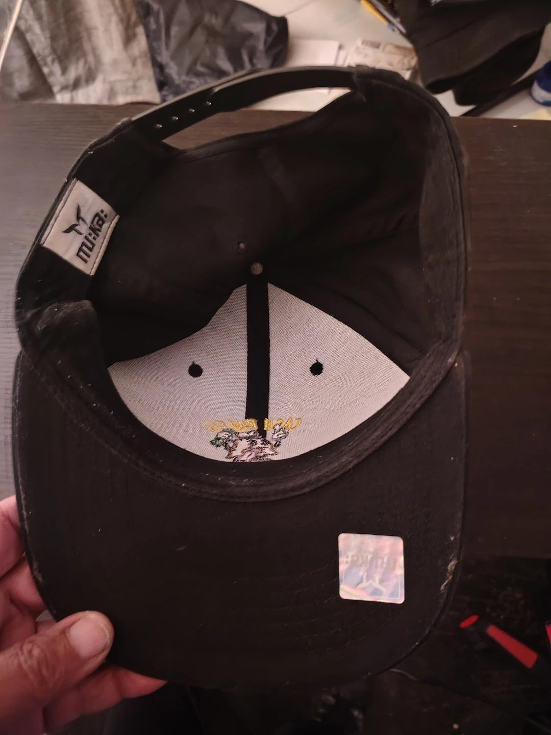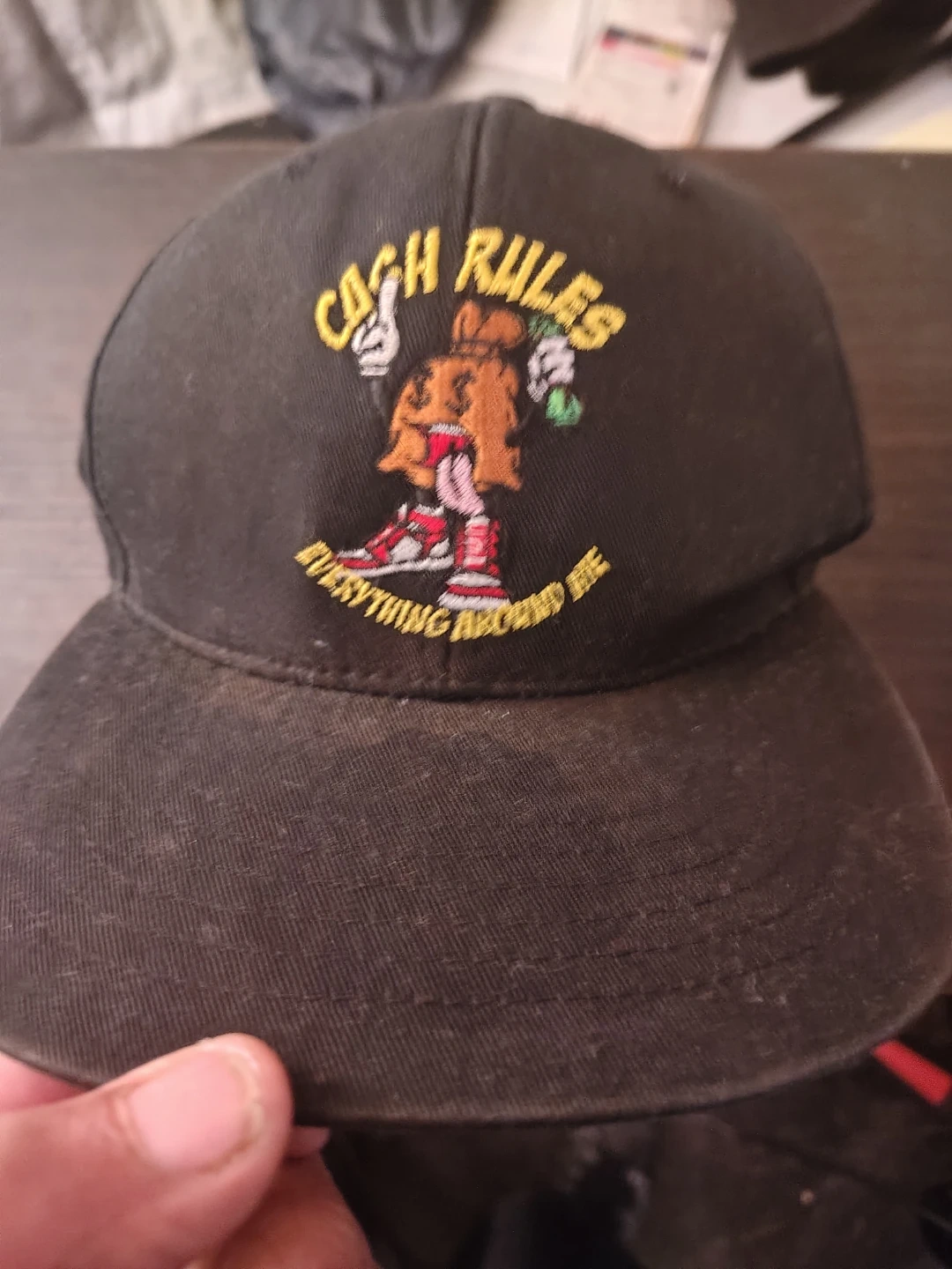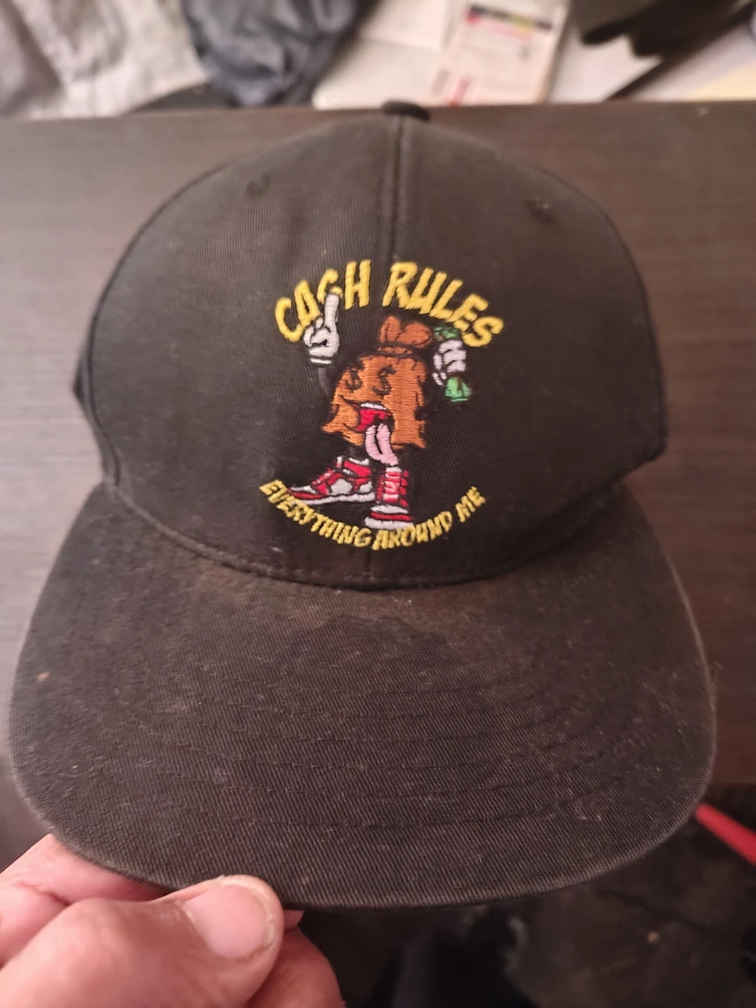 This black baseball cap features "Cash Rules Everything Around Me" embroidered on the front with a fun graphic. It has an adjustable snapback closure for a comfortable fit. The inside shows a "Mizuno" label.
