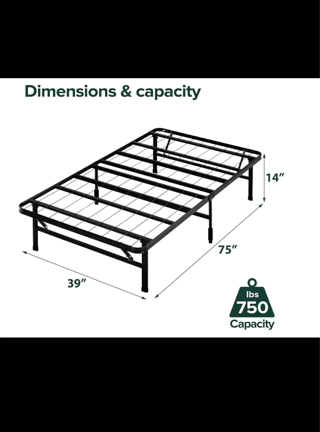 This is a twin-size folding bed frame. It's made of metal and has a capacity of 750 lbs. The frame measures 39" x 75" x 14".
