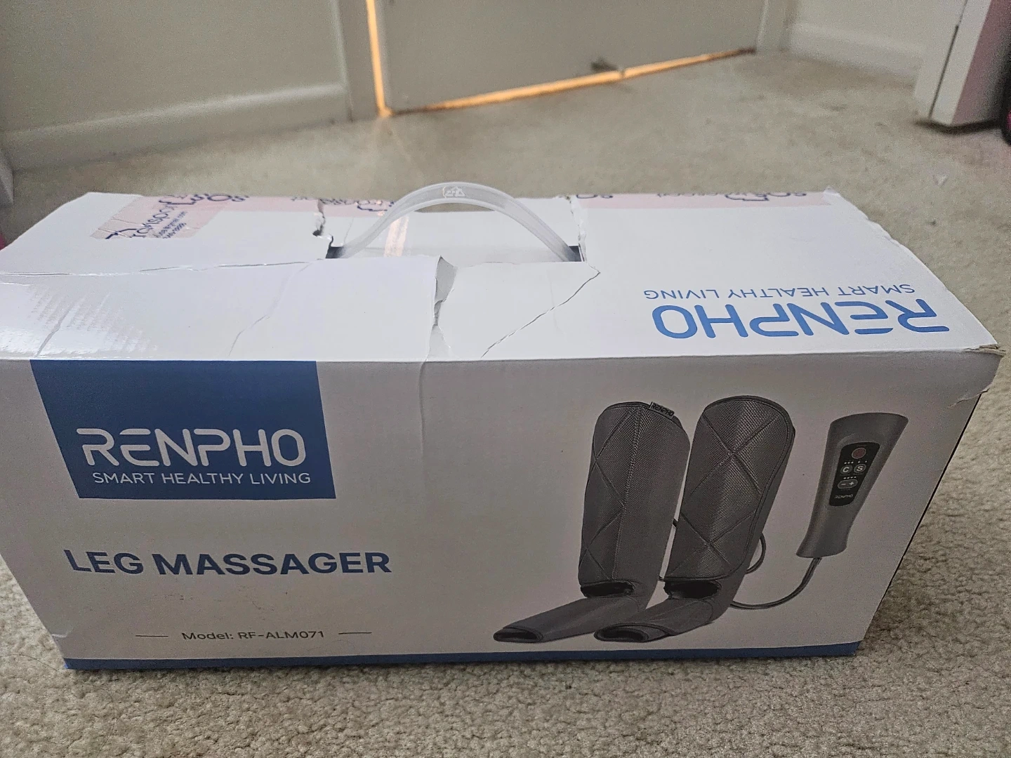 This is a Renpho electric leg massager. It comes with the leg wraps and the control unit. The massager includes adjustable intensity. It's great for relaxation!