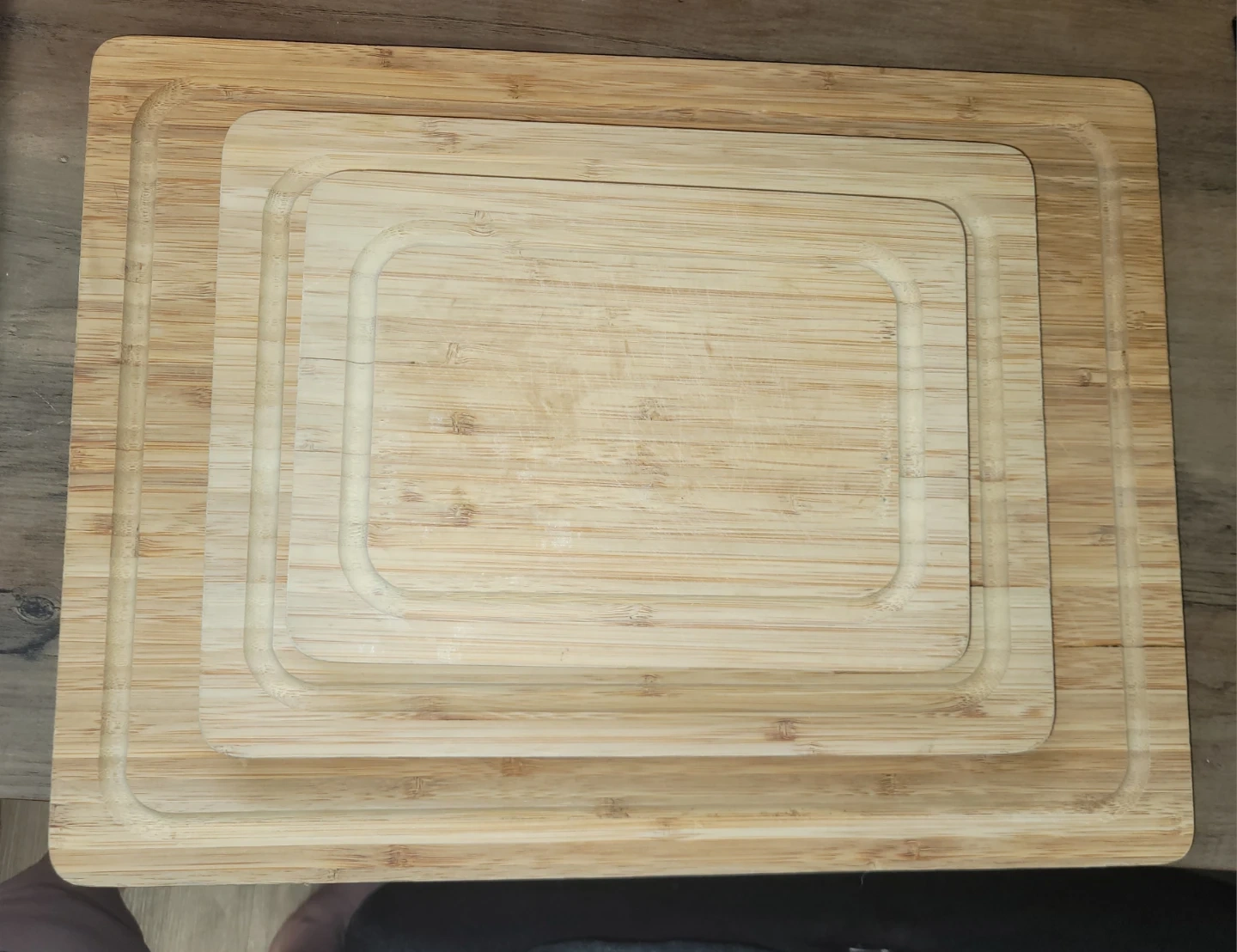 This is a set of three bamboo cutting boards. They're made of natural bamboo material. Each board features a juice groove to catch messes. This set is handy for various food prep tasks in the kitchen!