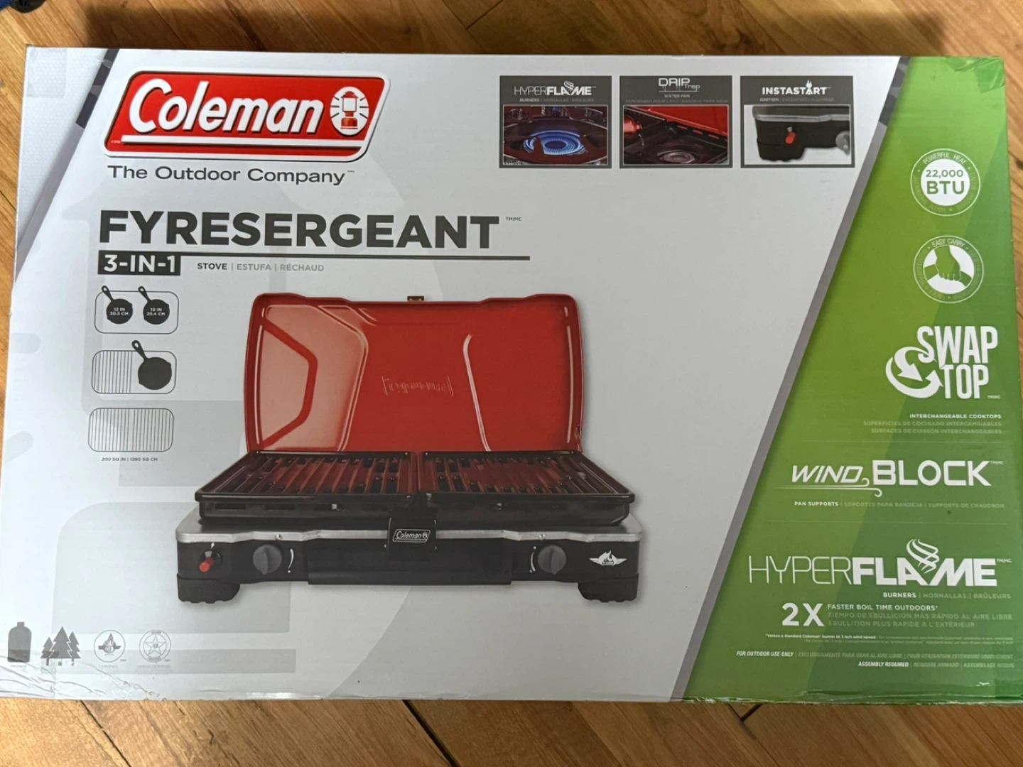 Coleman FYRESERGEANT 3-in-1 stove with Hyperflame technology. It features interchangeable cooktops and a wind block system. Total cooking area is 200 sq in.