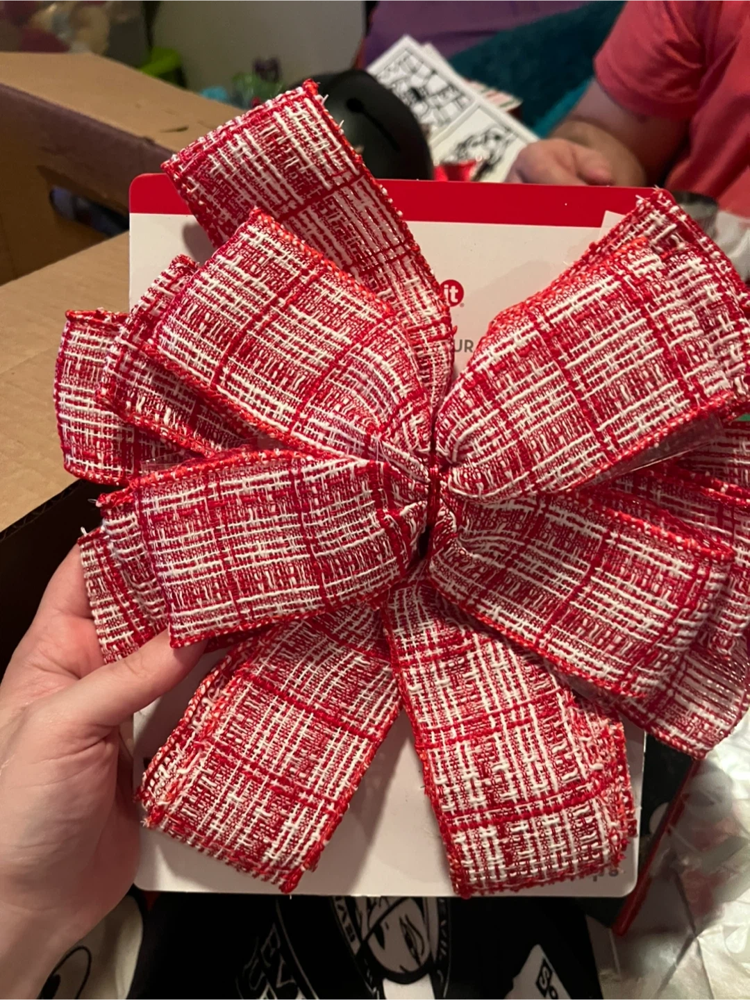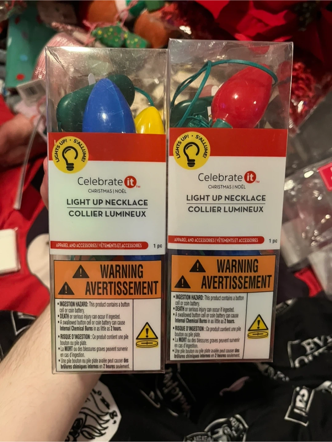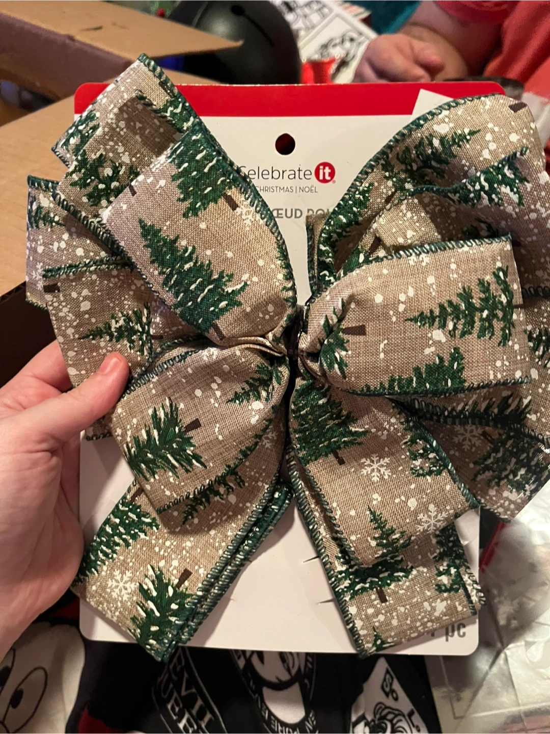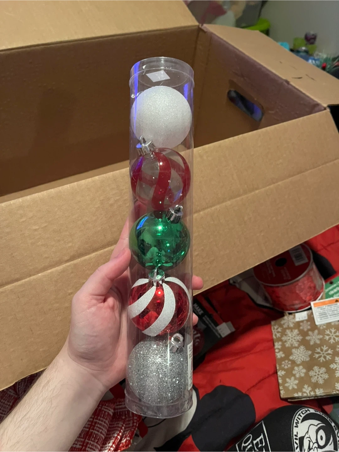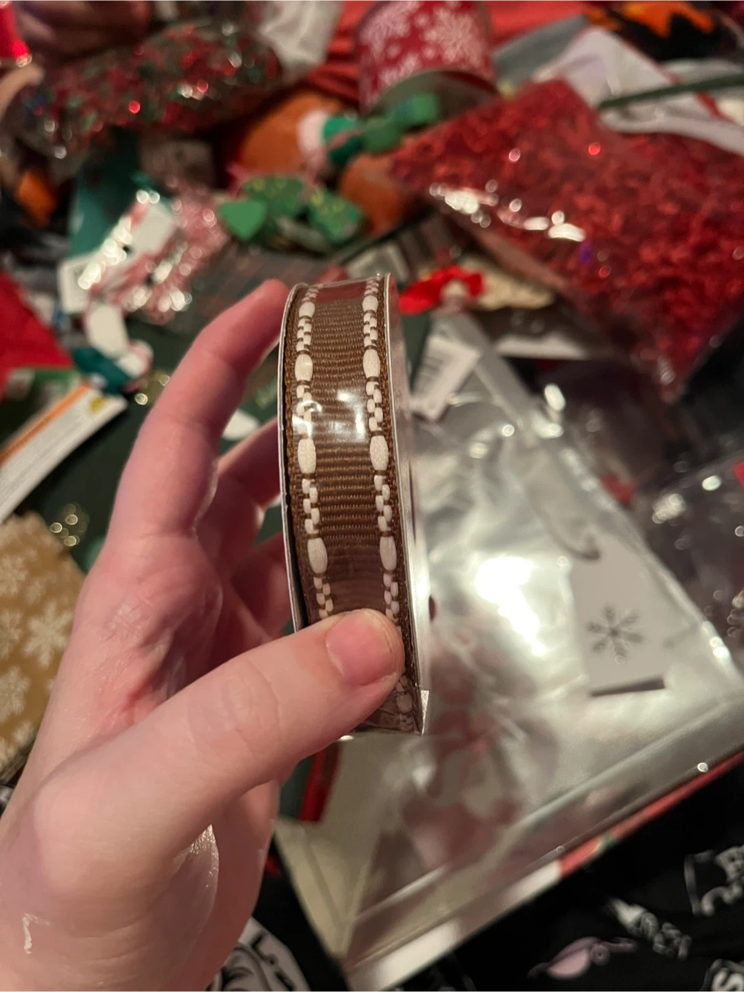 Bundle of festive Christmas decor. Includes a tube of assorted baubles, two "Light Up Necklace" sets, a brown ribbon with a white pattern, and two decorative bows (one red/white plaid, one with trees). Perfect for adding some holiday cheer to your home!