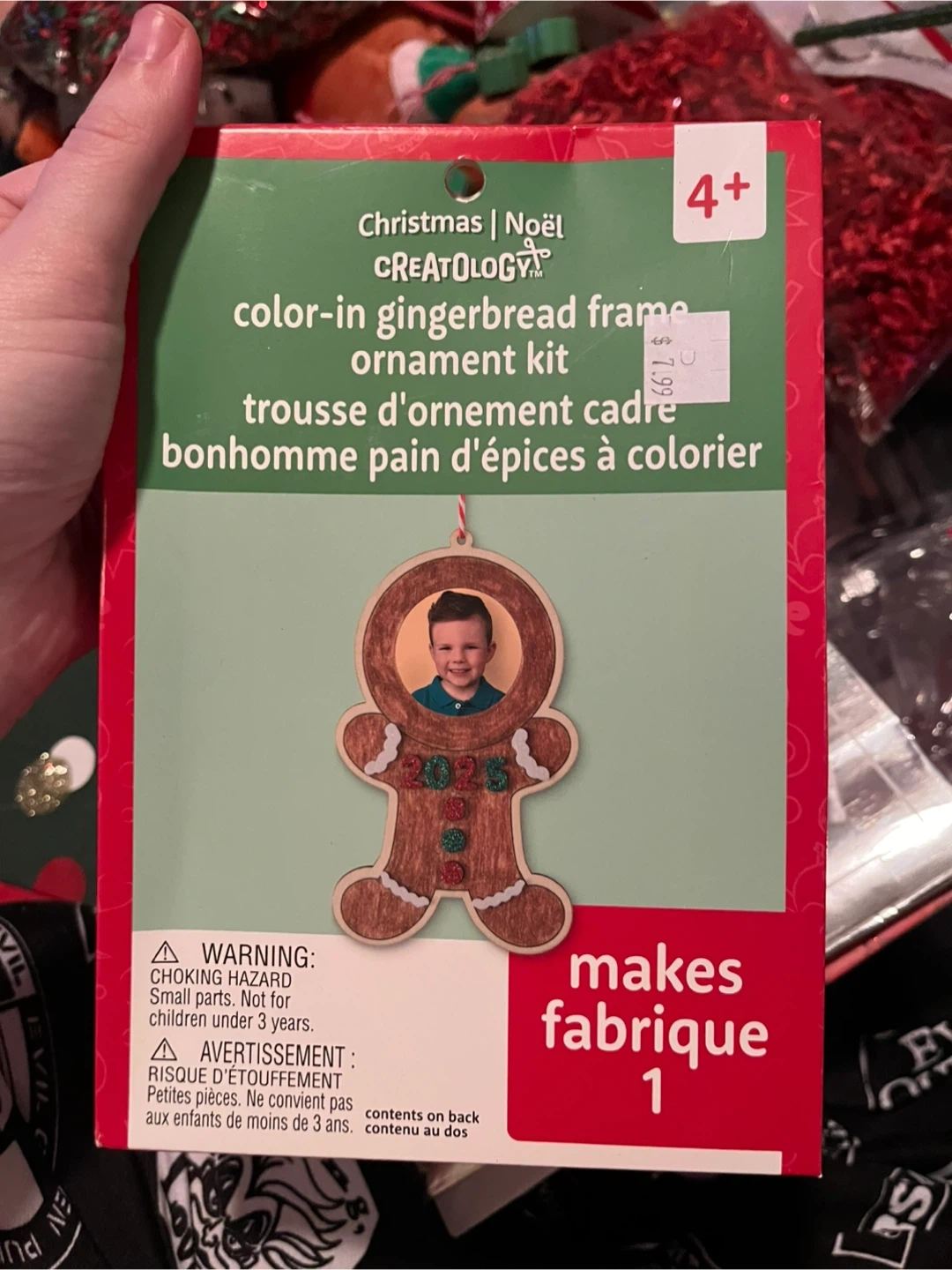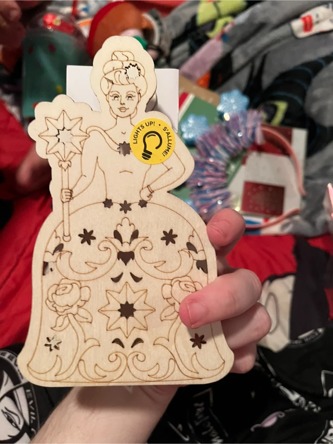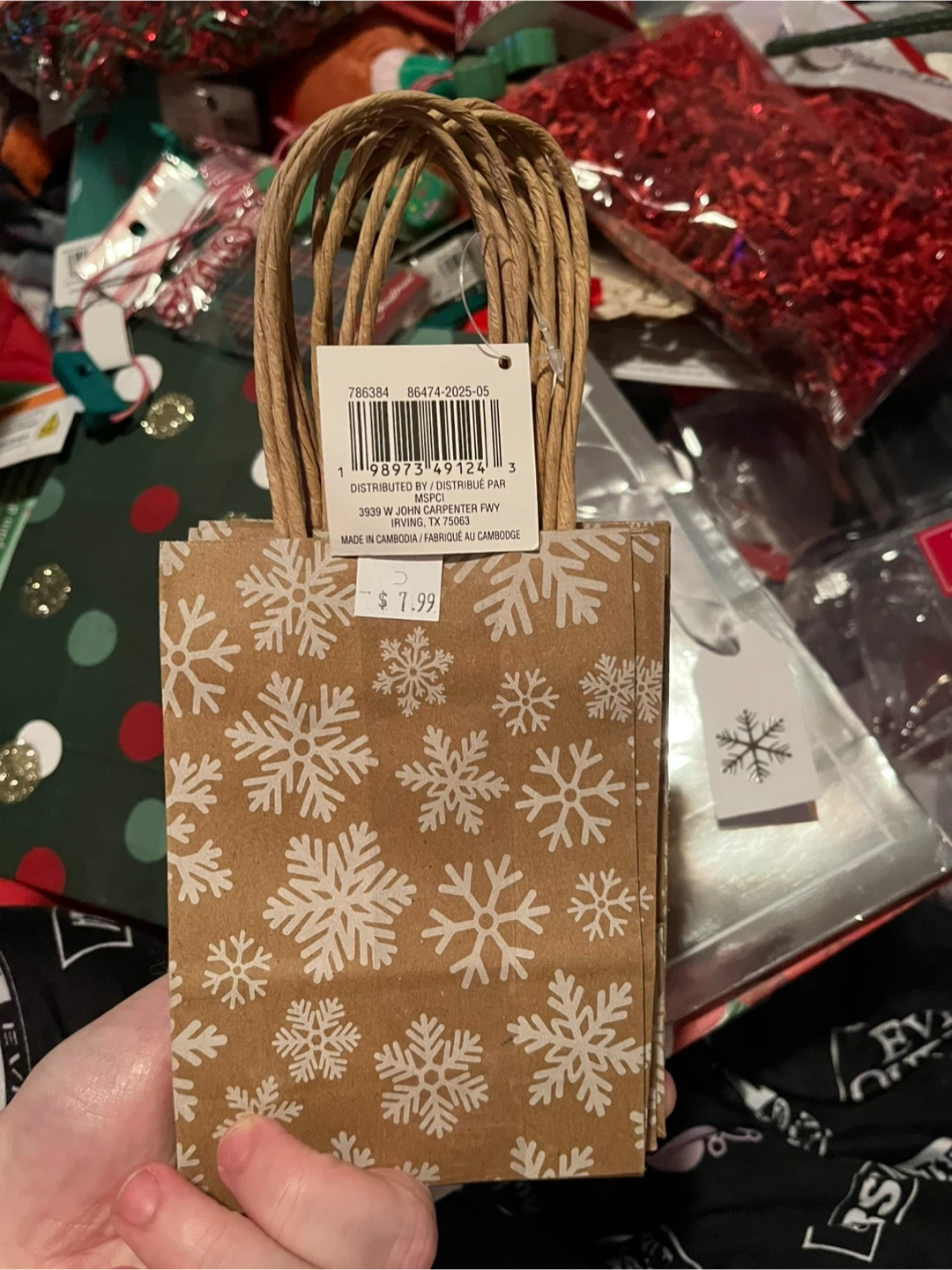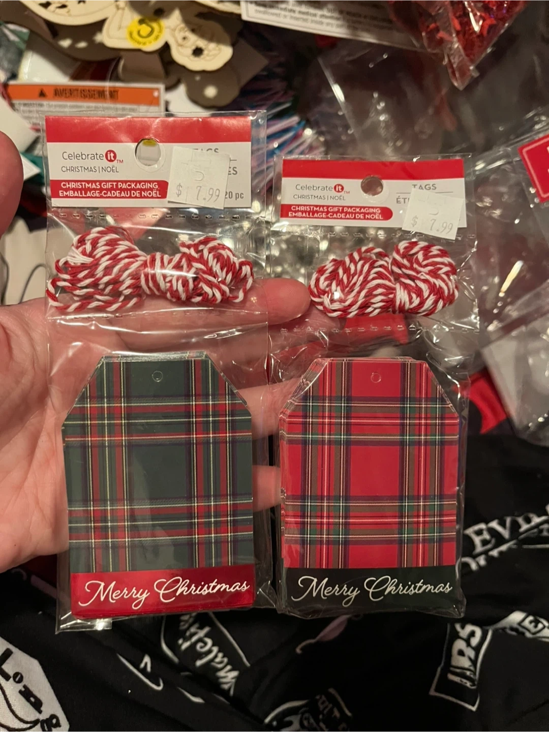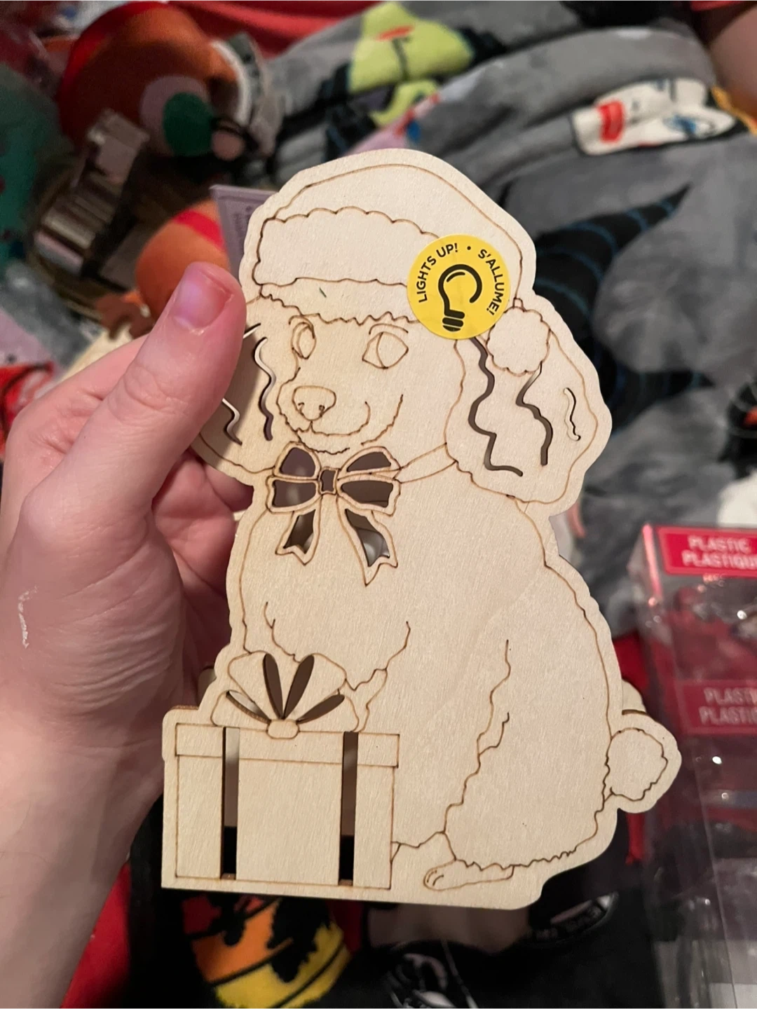 Bundle of festive Christmas decor. Includes a tube of assorted baubles, two "Light Up Necklace" sets, a brown ribbon with a white pattern, and two decorative bows (one red/white plaid, one with trees). Perfect for adding some holiday cheer to your home!