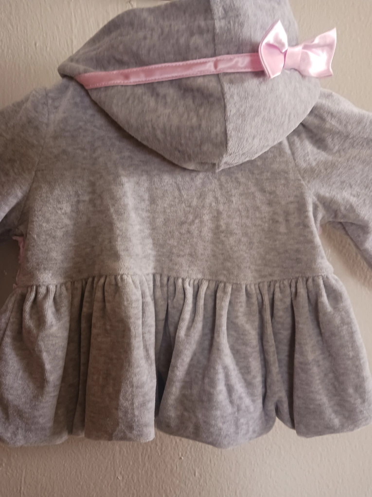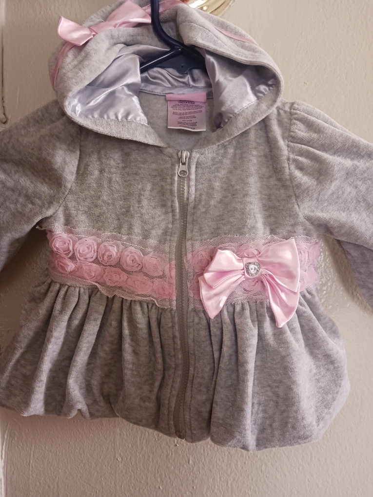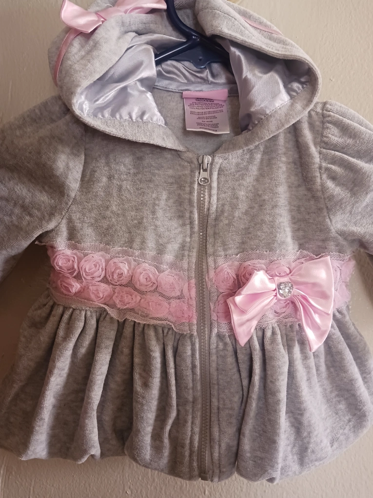 This adorable Nannette Baby hooded jacket is perfect for your little one! It features a charming gray color with pink accents, including a cute bow and rose detailing. The jacket has a full zipper and a comfortable hood, making it both stylish and practical.