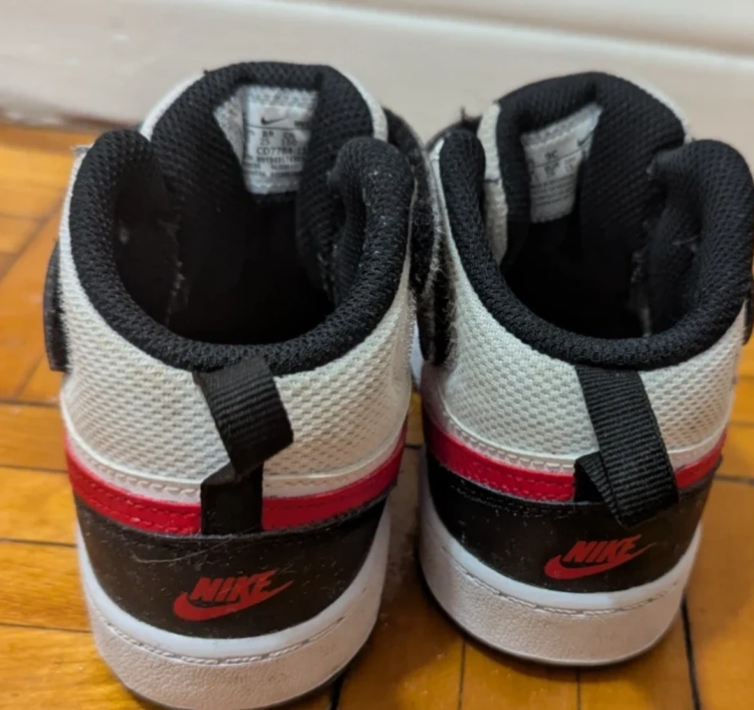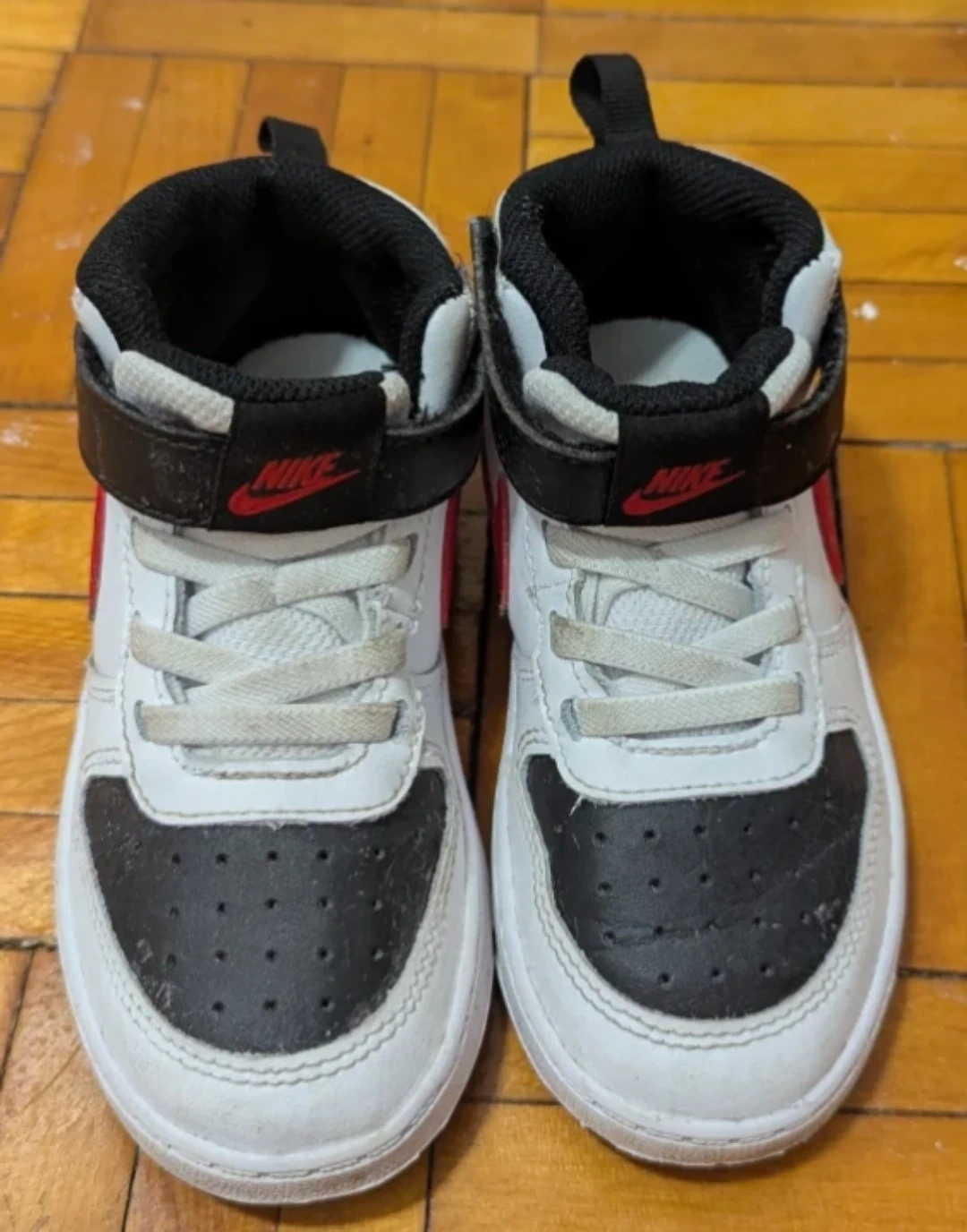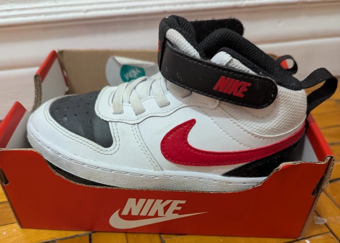 Nike mid-top sneakers for little ones. White, black, and red colourway. Features Velcro straps for easy on and off. Includes original box.